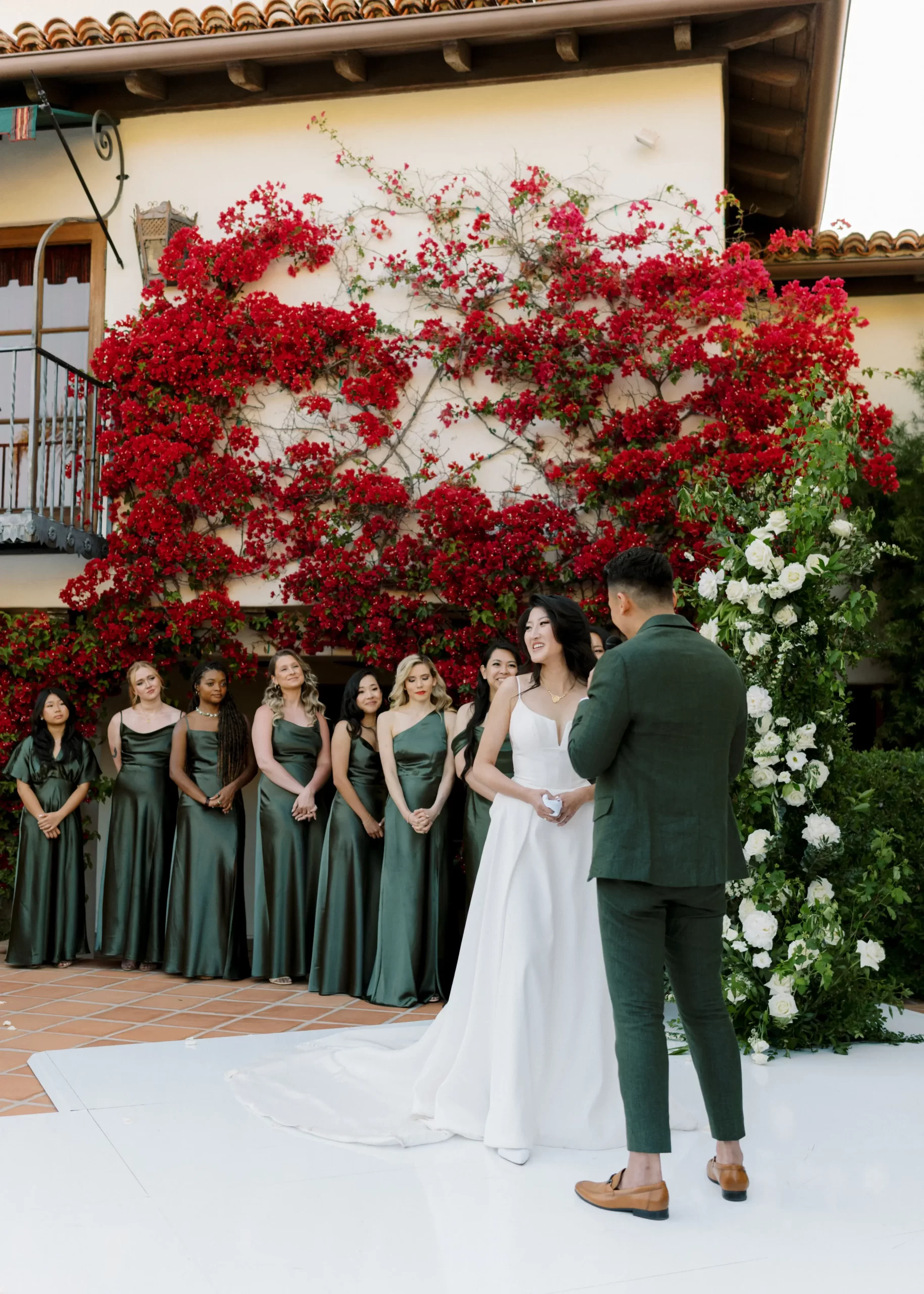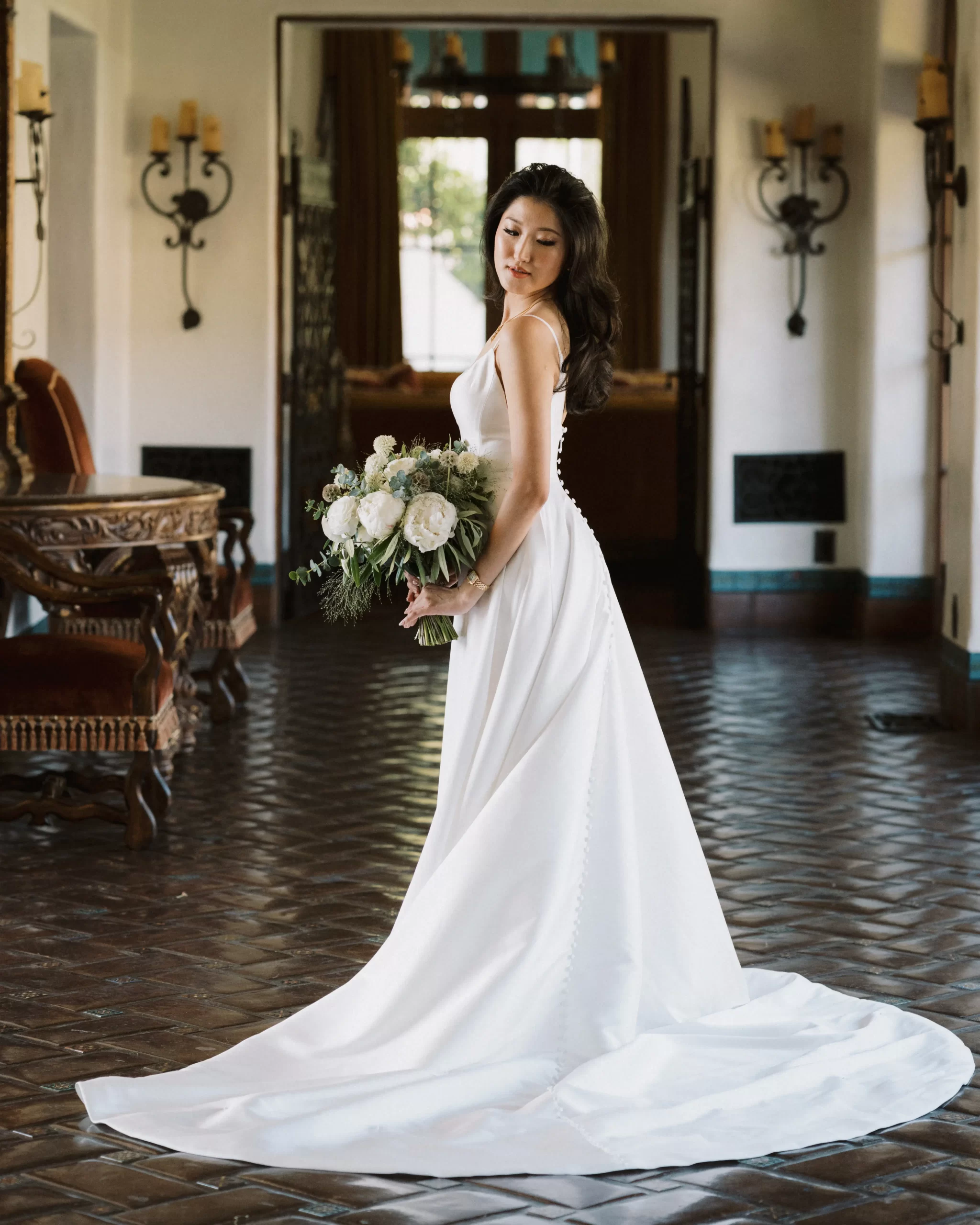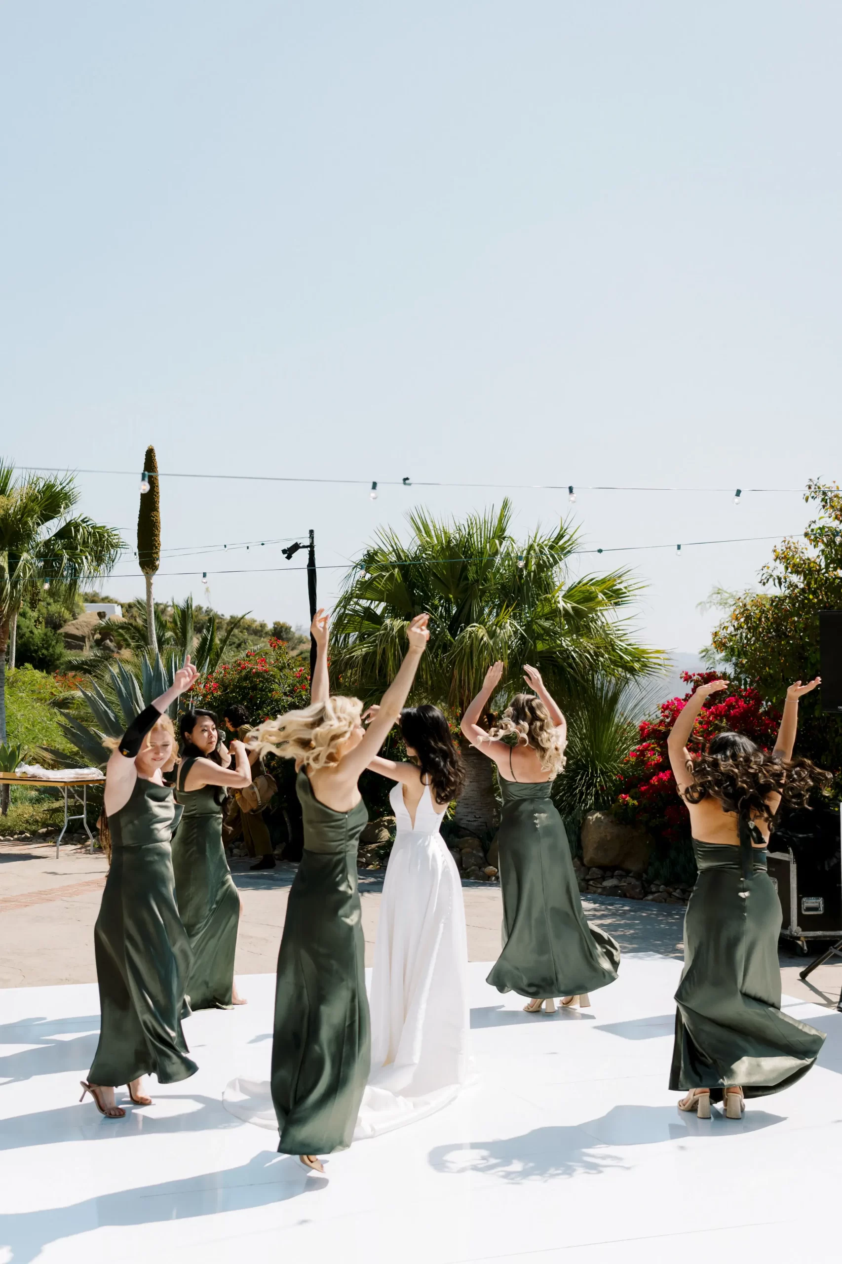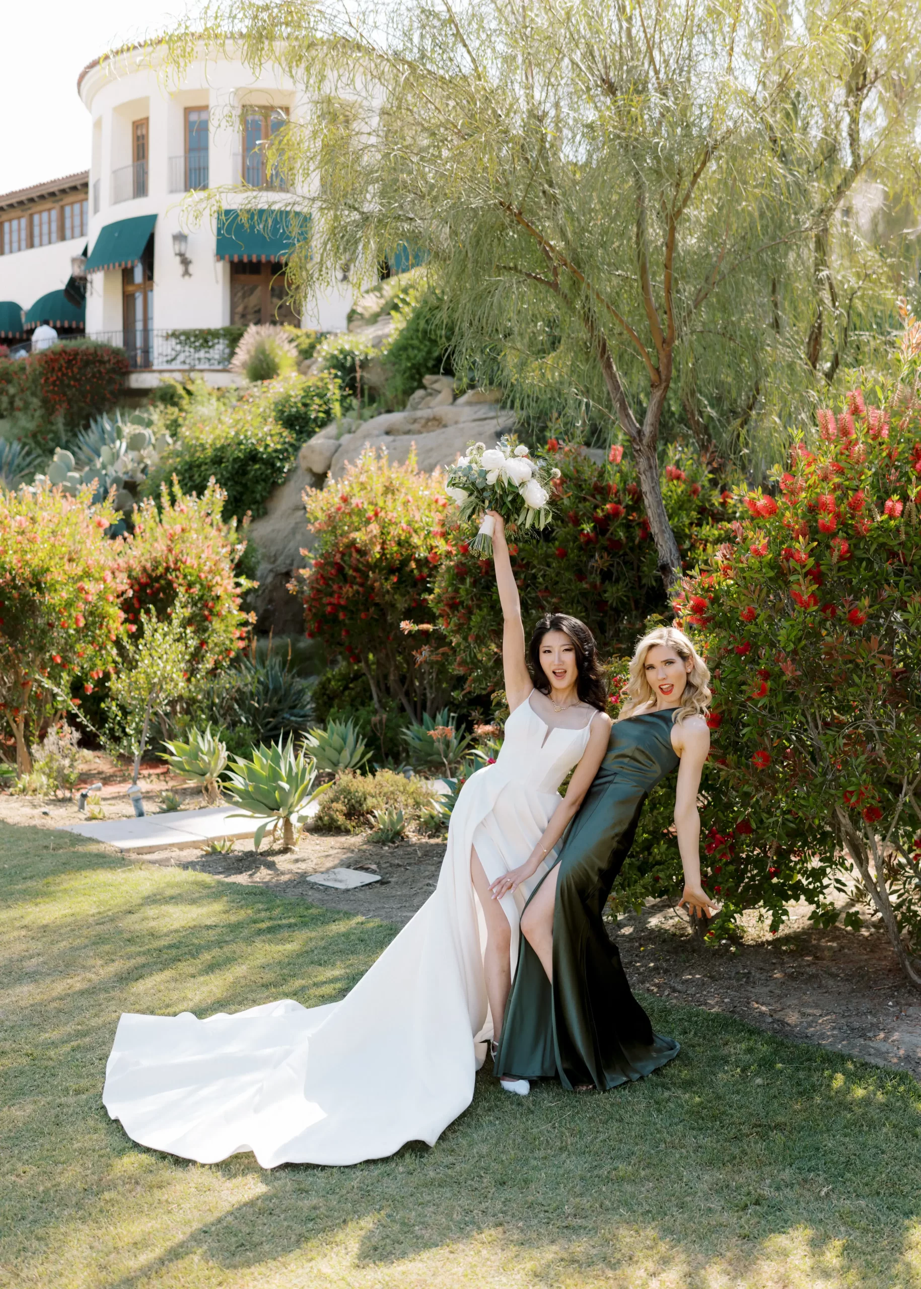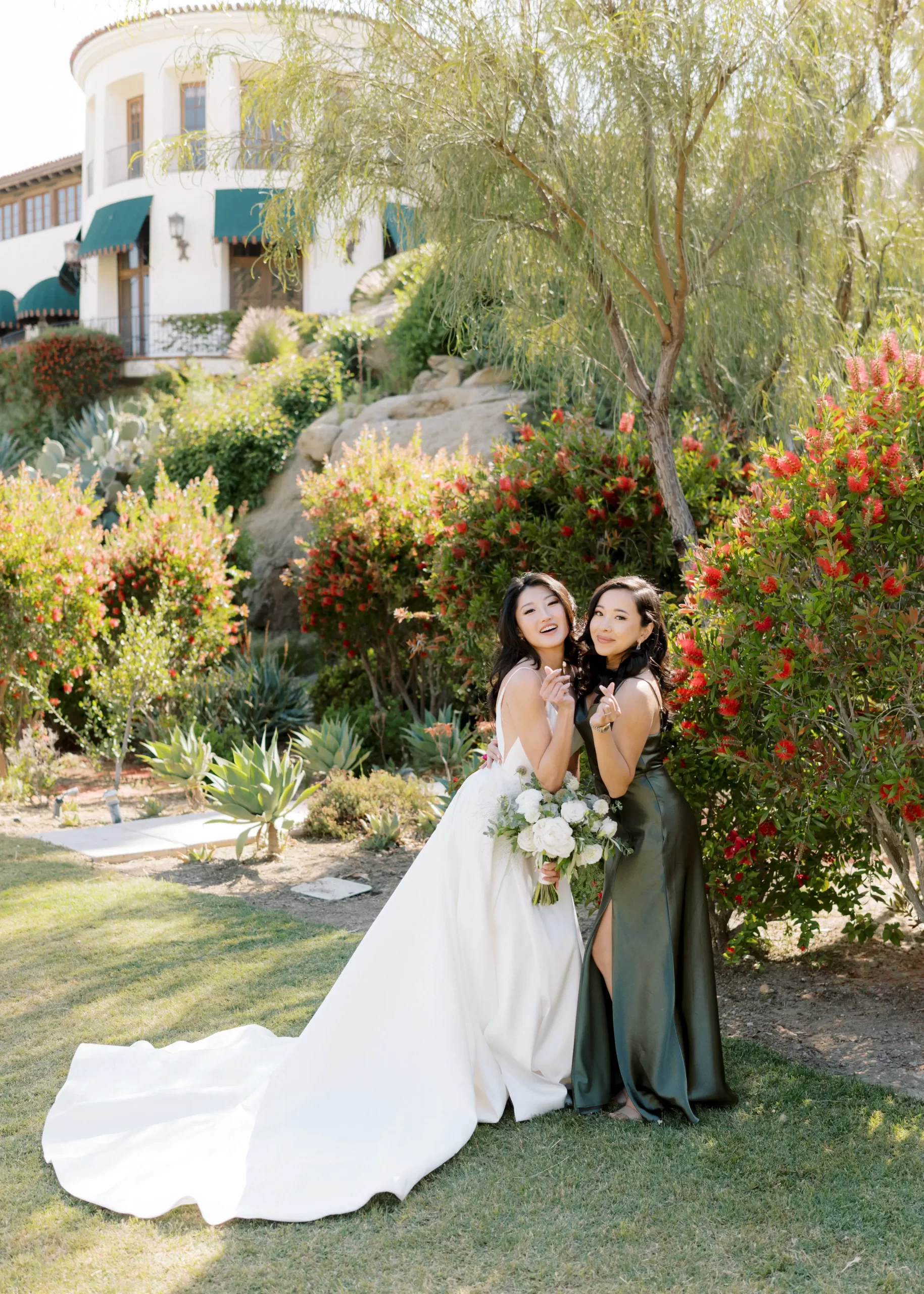 We wanted our wedding theme to seamlessly blend with the venue’s overall vibe. Our first impression was ‘Old Hollywood Glamour’. (It’s no wonder that Damien Chazelle movie Babylon, starring Brad Pitt and Margot Robbie was filmed here) This inspired our choice of satin-finished dresses with clean lines for both the bride and bridesmaids. To lighten things up, we incorporated whimsical Mediterranean elements into our floral arrangements and stationery.