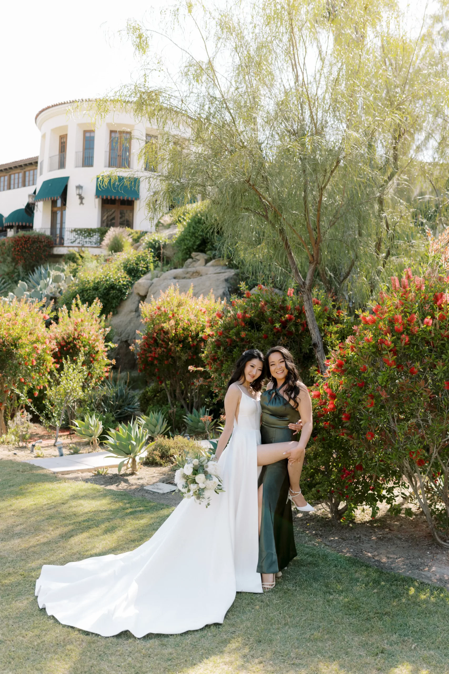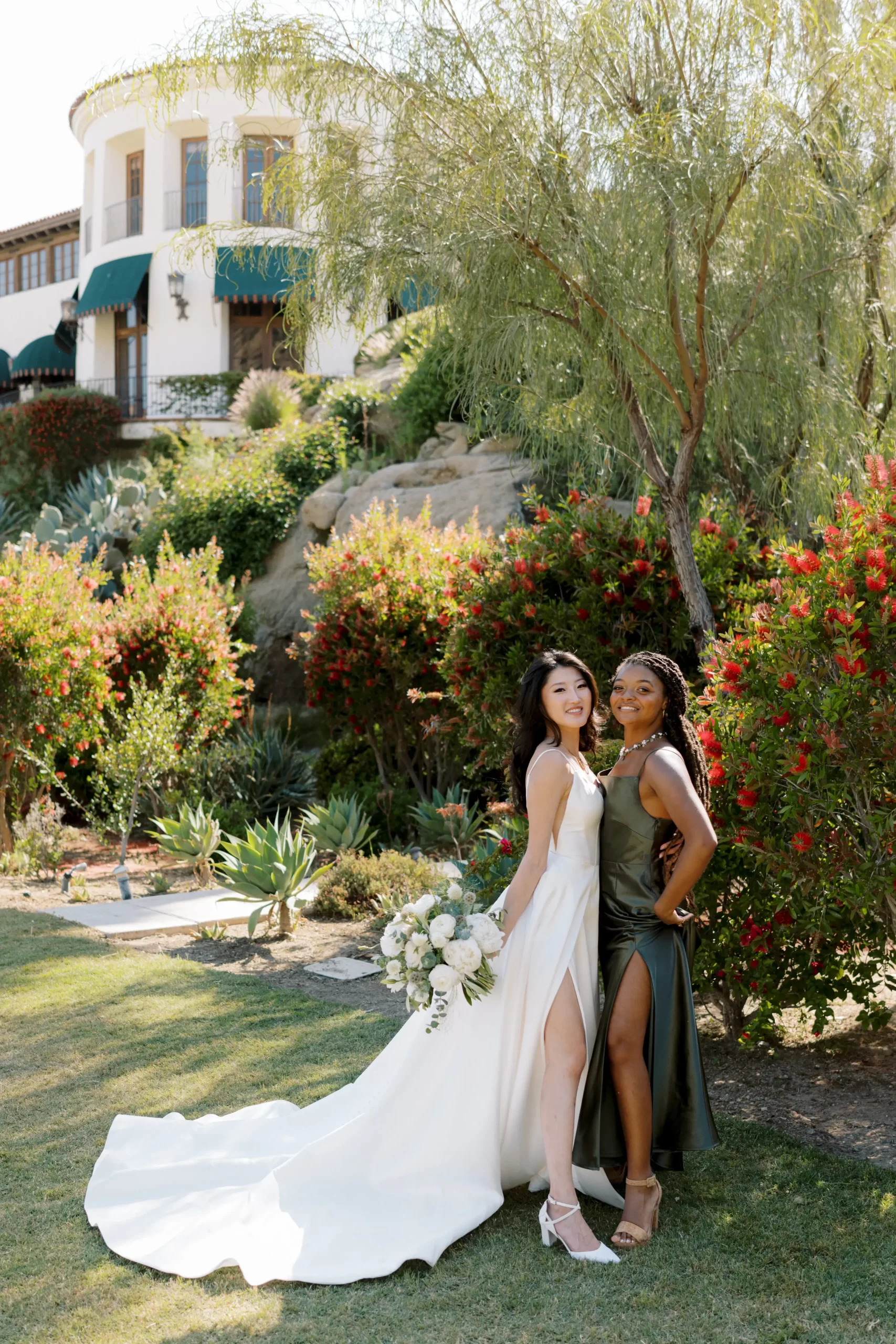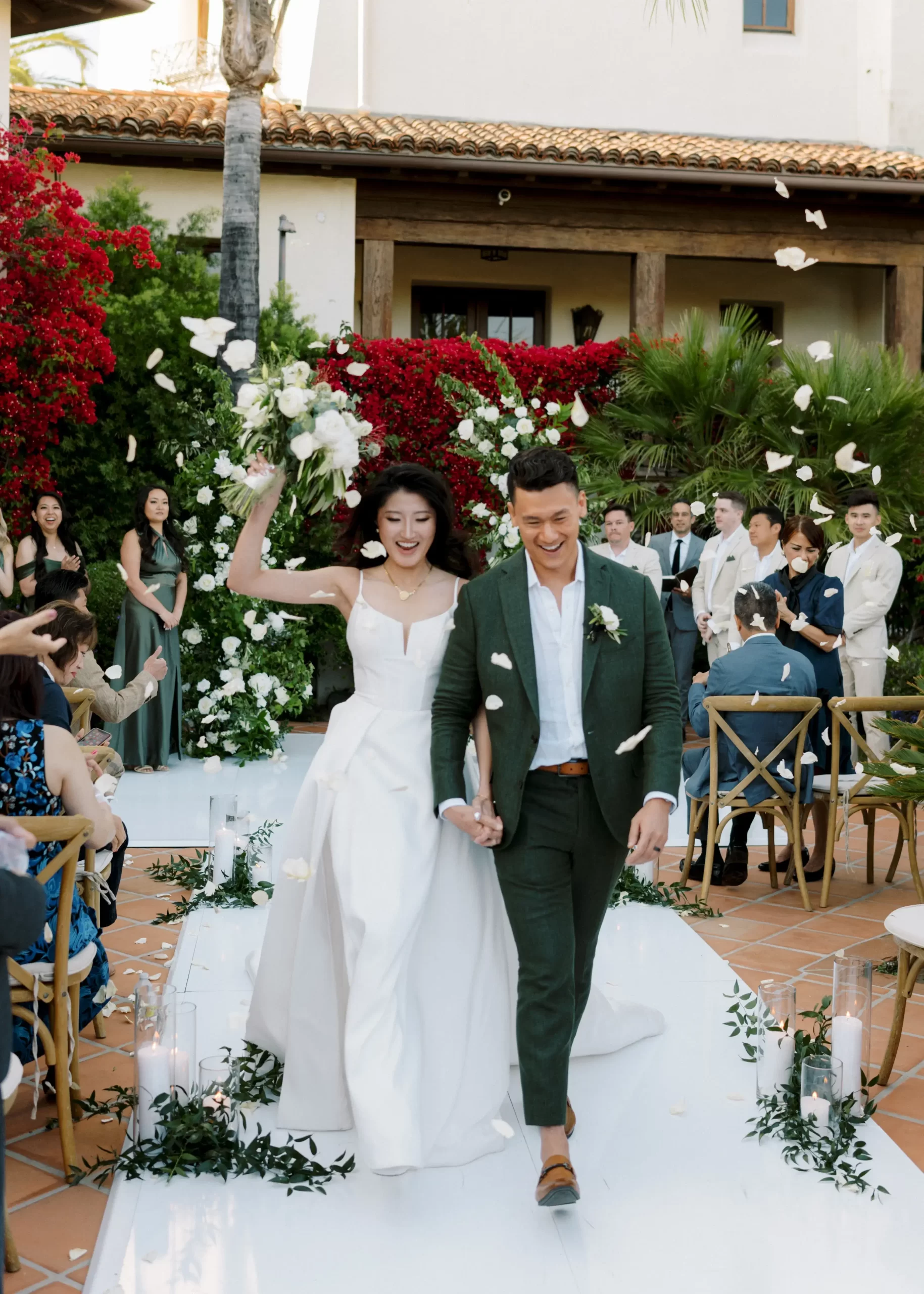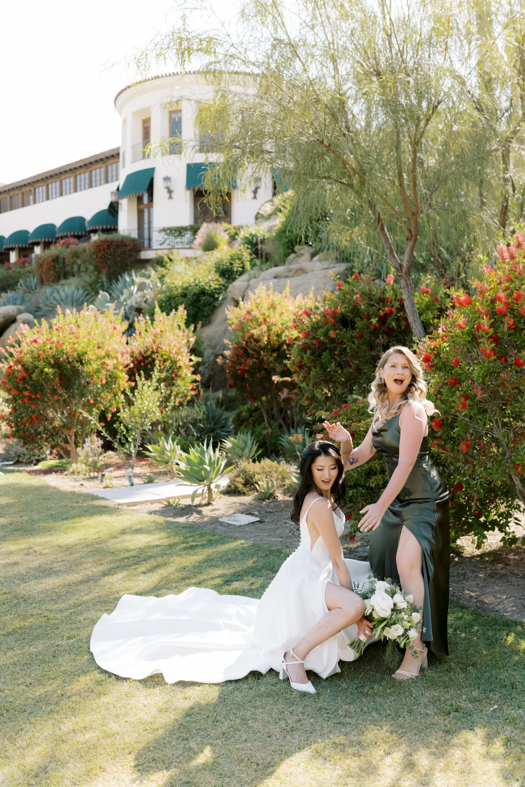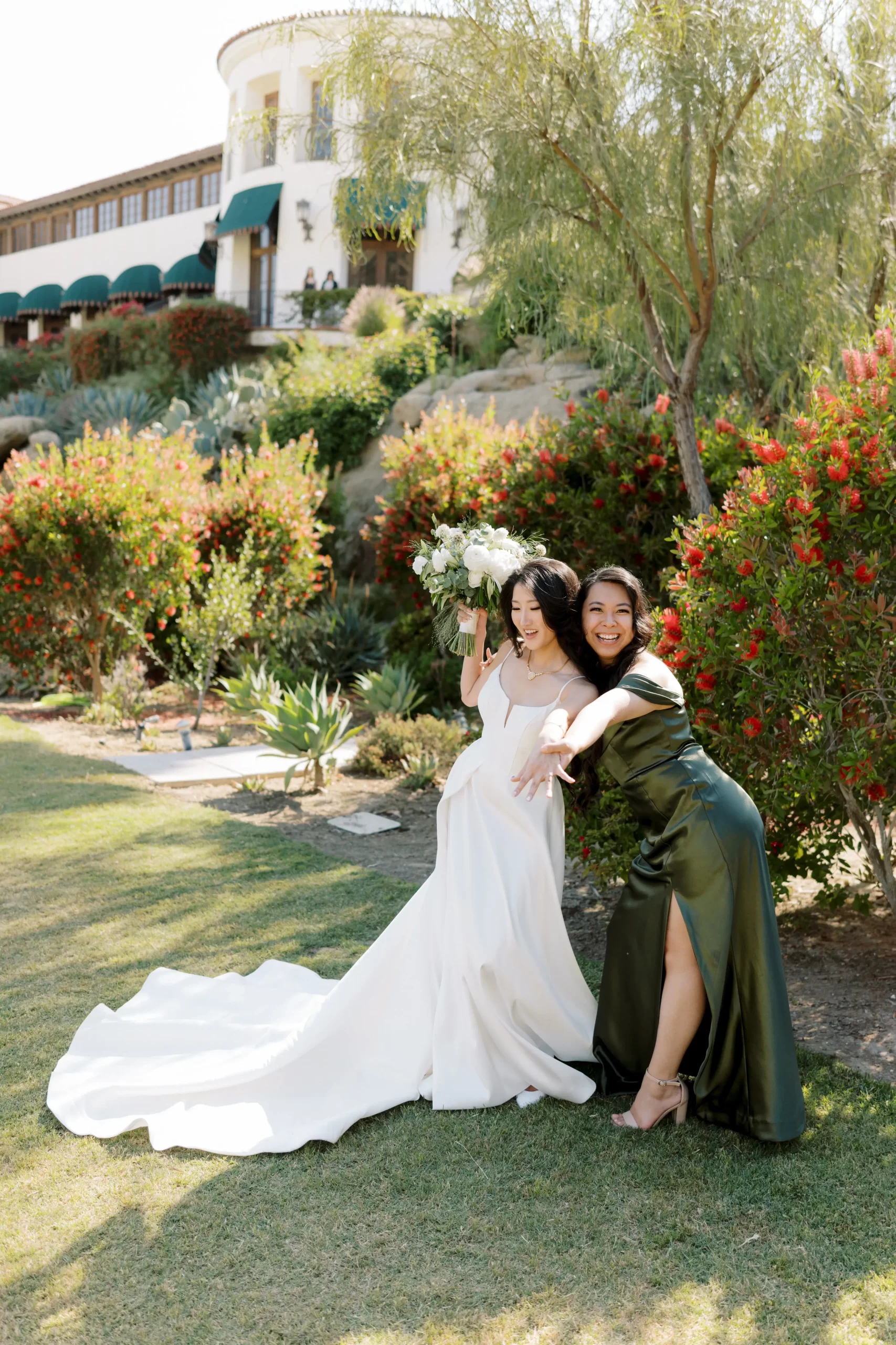 We wanted our wedding theme to seamlessly blend with the venue’s overall vibe. Our first impression was ‘Old Hollywood Glamour’. (It’s no wonder that Damien Chazelle movie Babylon, starring Brad Pitt and Margot Robbie was filmed here) This inspired our choice of satin-finished dresses with clean lines for both the bride and bridesmaids. To lighten things up, we incorporated whimsical Mediterranean elements into our floral arrangements and stationery.