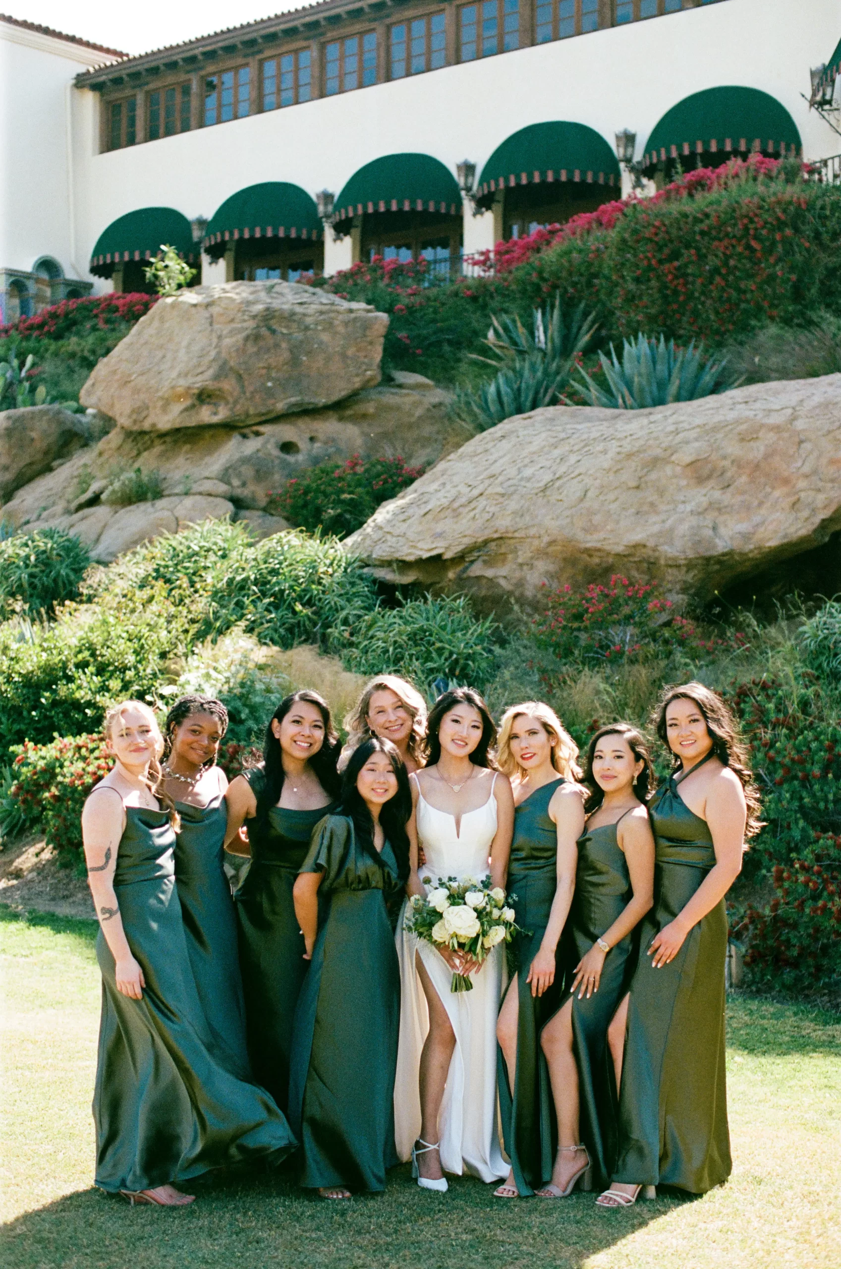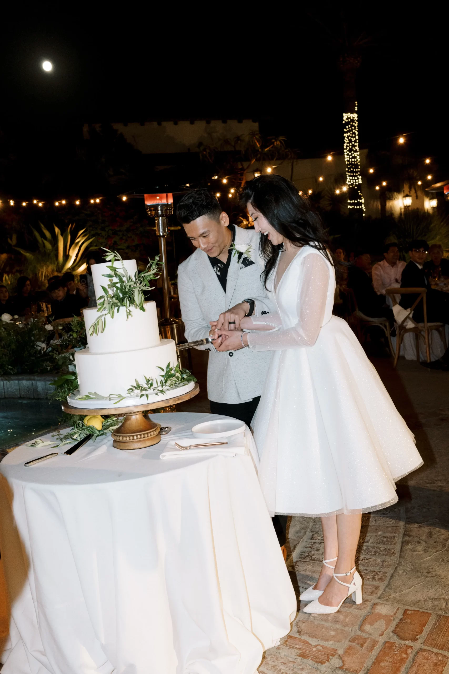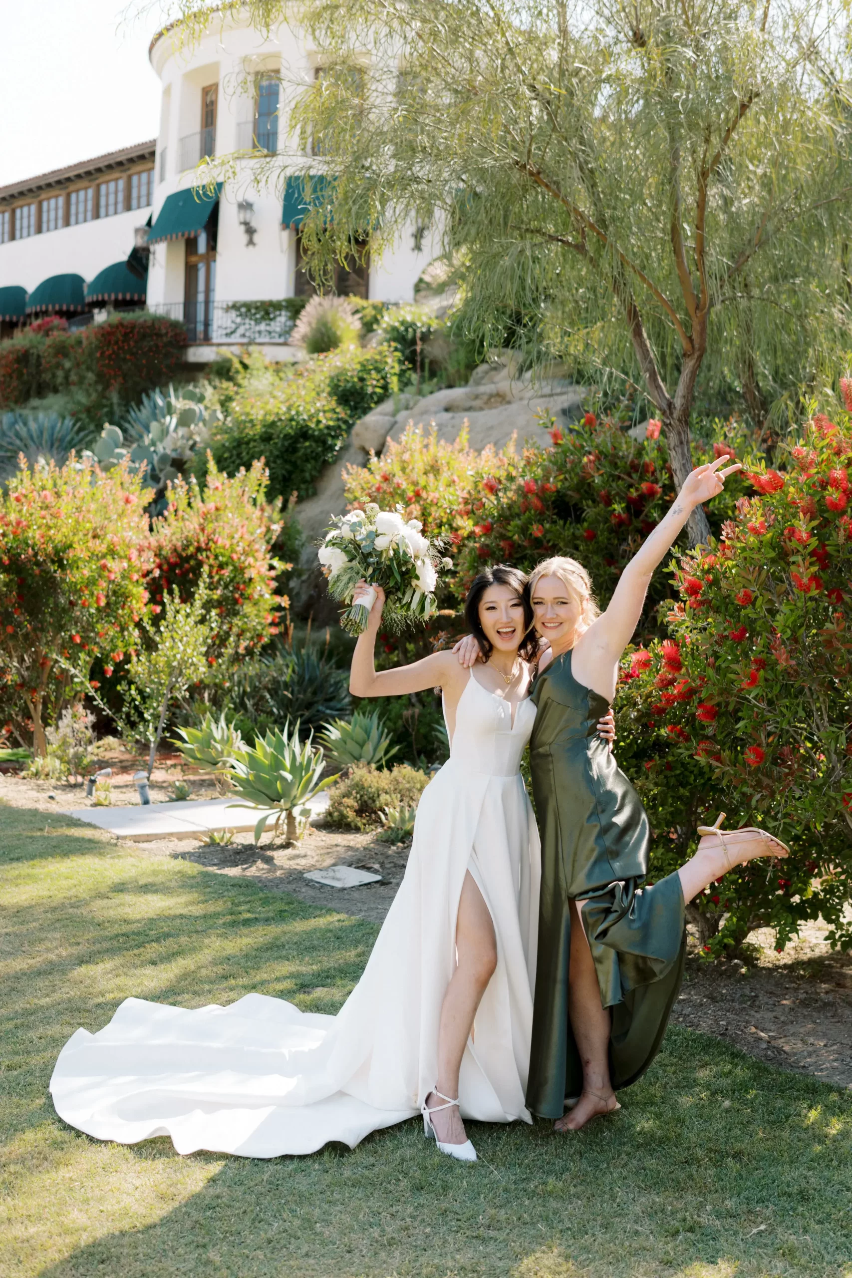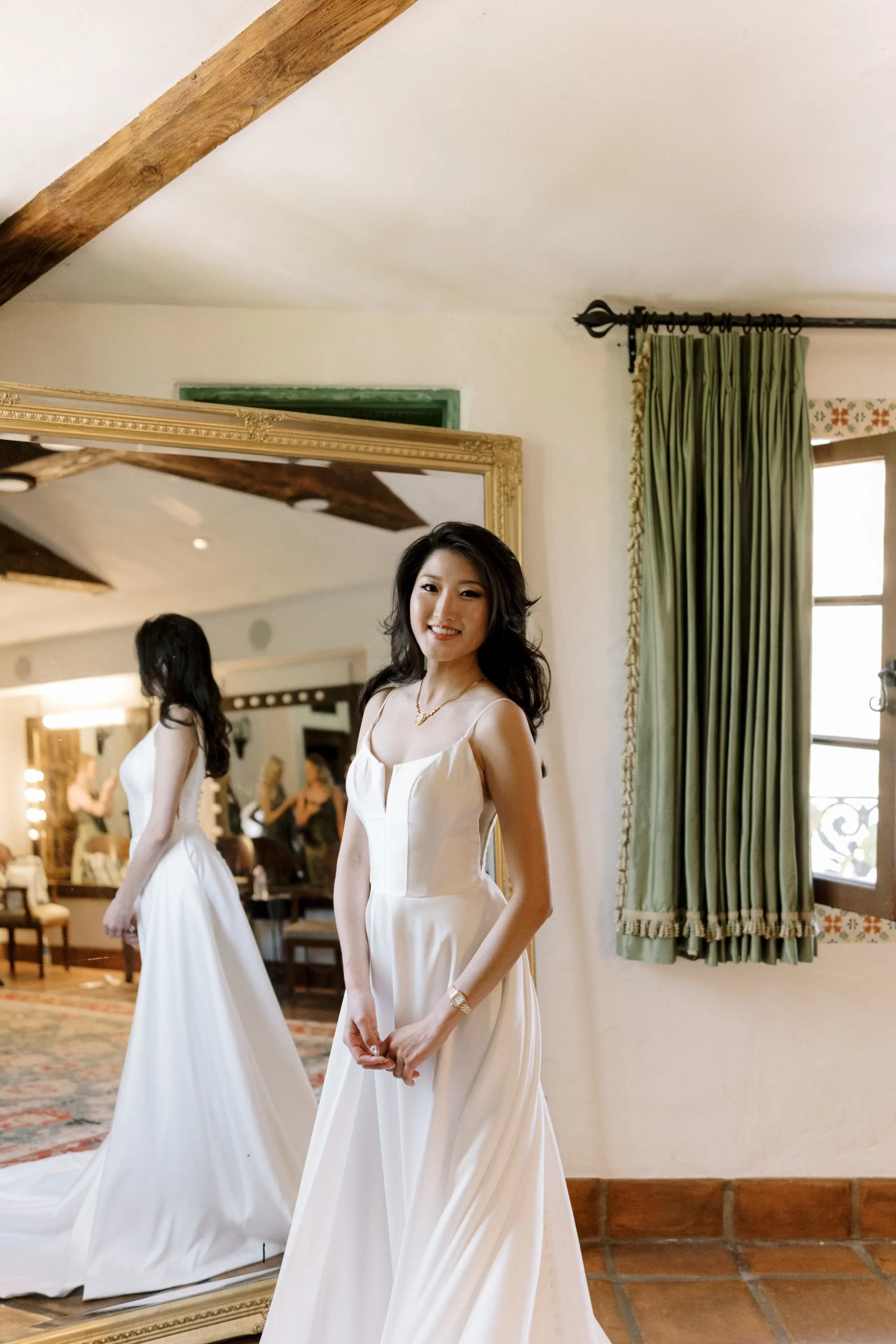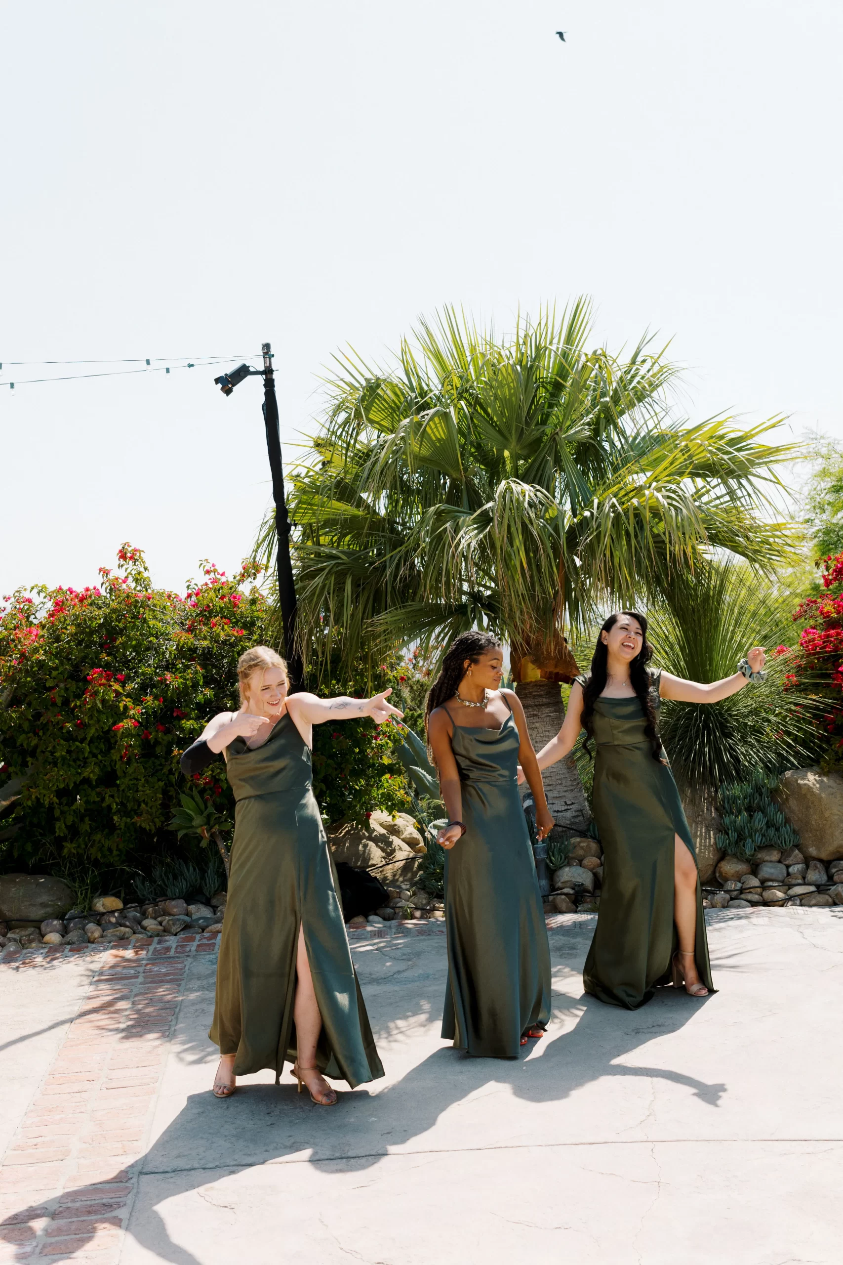 We wanted our wedding theme to seamlessly blend with the venue’s overall vibe. Our first impression was ‘Old Hollywood Glamour’. (It’s no wonder that Damien Chazelle movie Babylon, starring Brad Pitt and Margot Robbie was filmed here) This inspired our choice of satin-finished dresses with clean lines for both the bride and bridesmaids. To lighten things up, we incorporated whimsical Mediterranean elements into our floral arrangements and stationery.