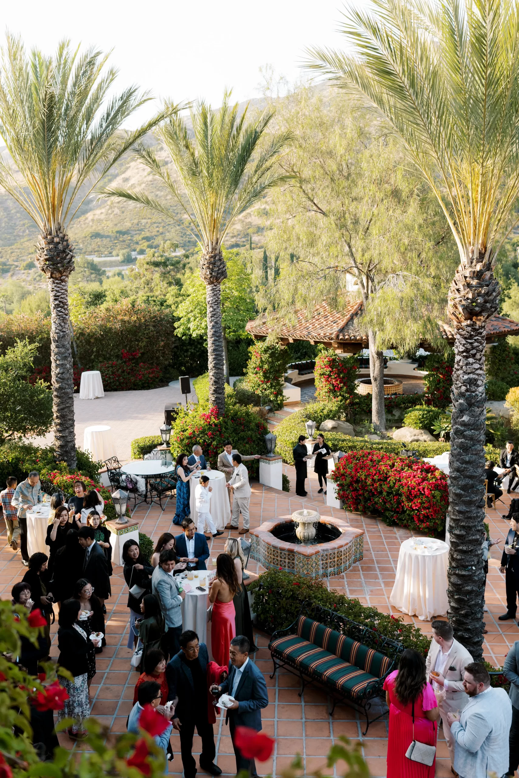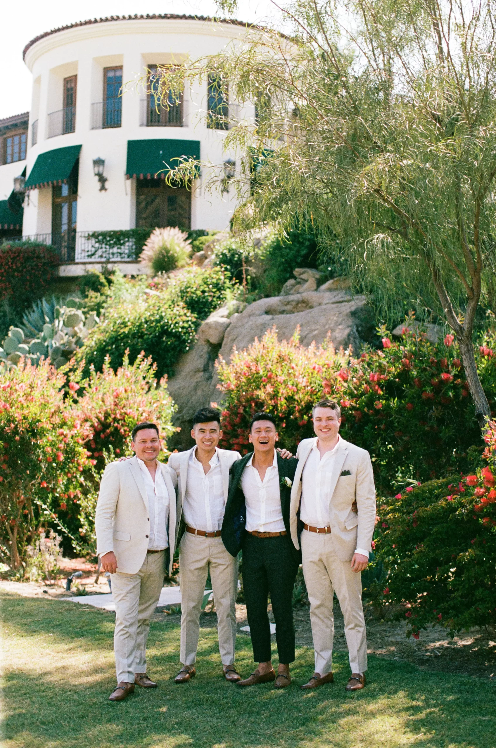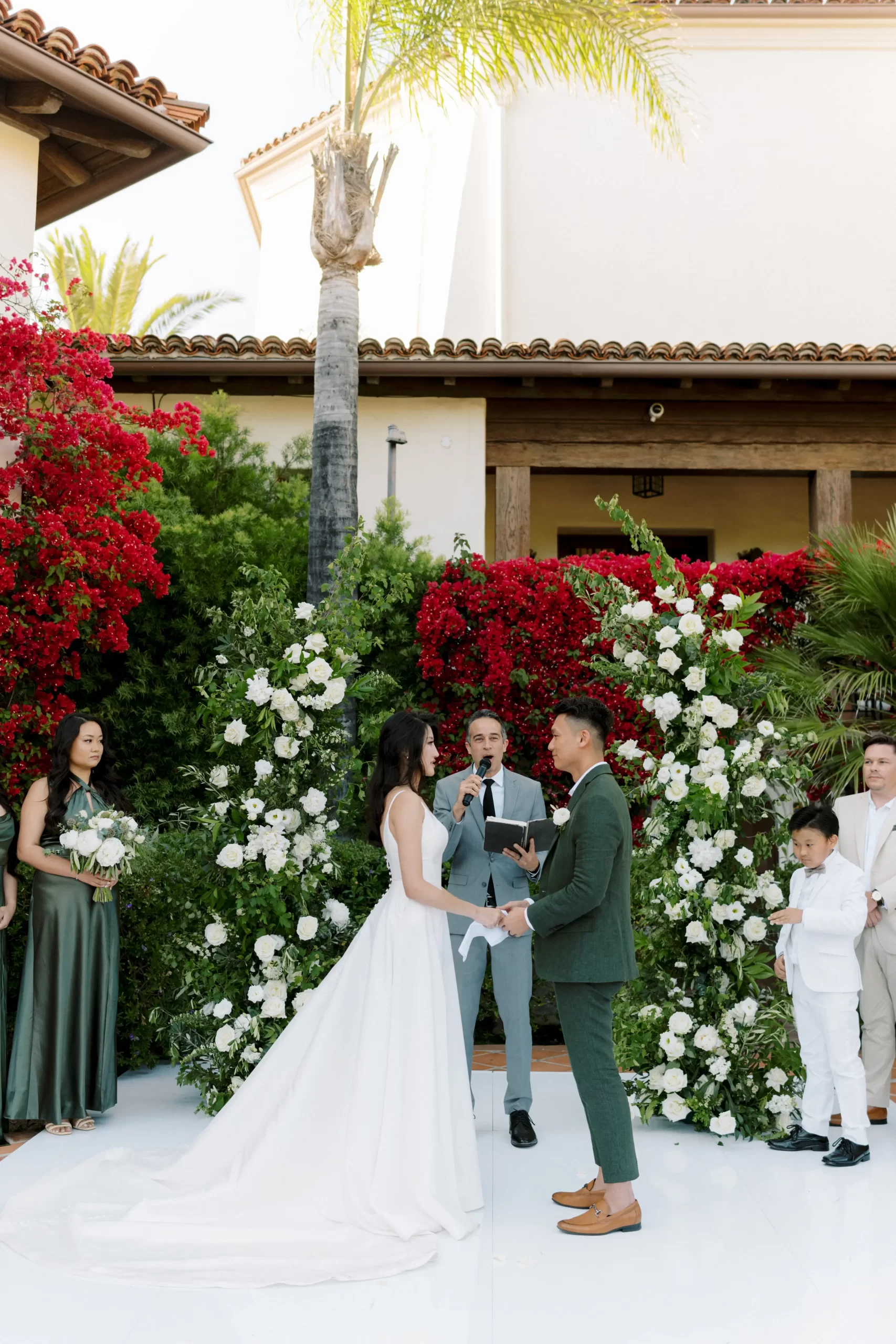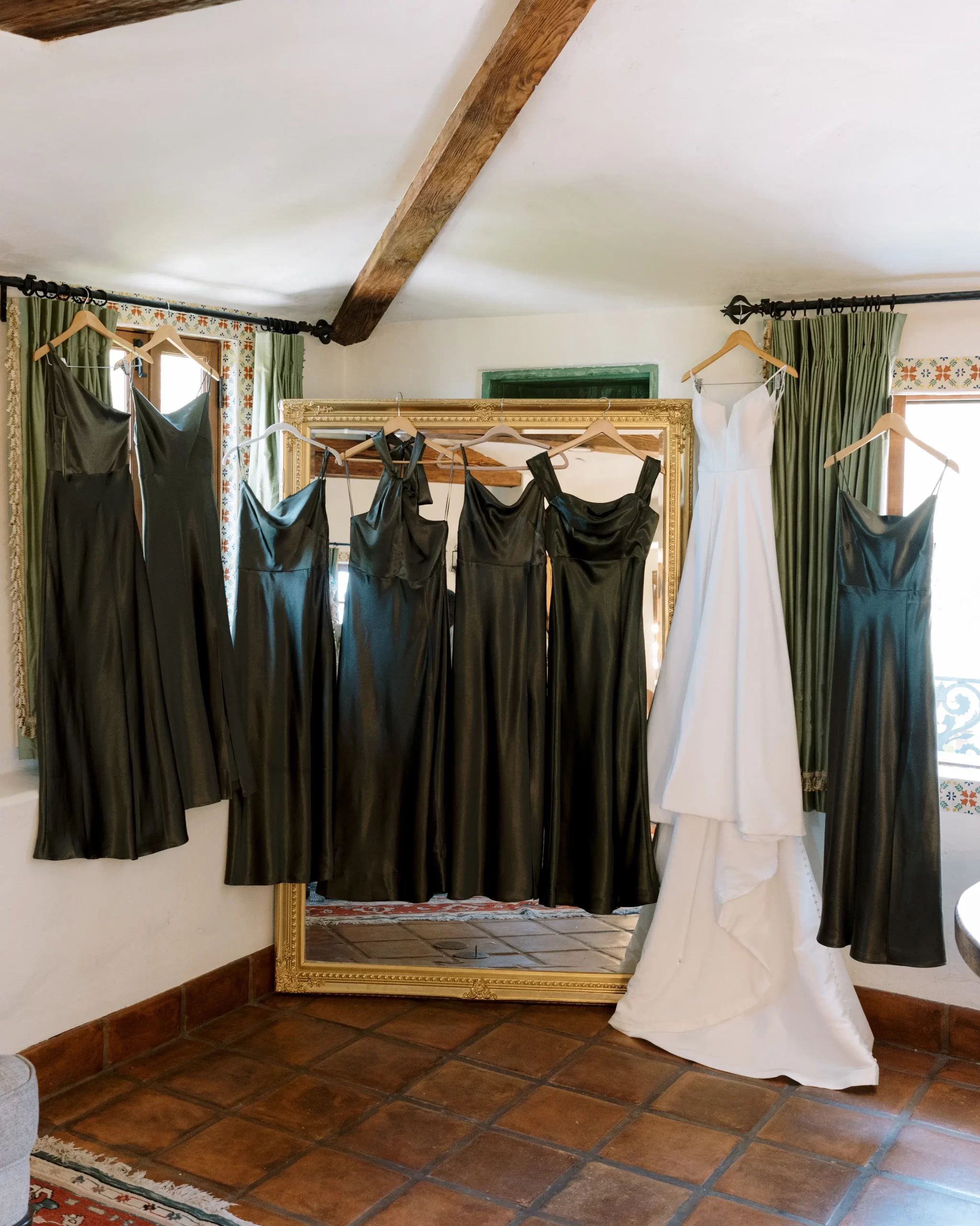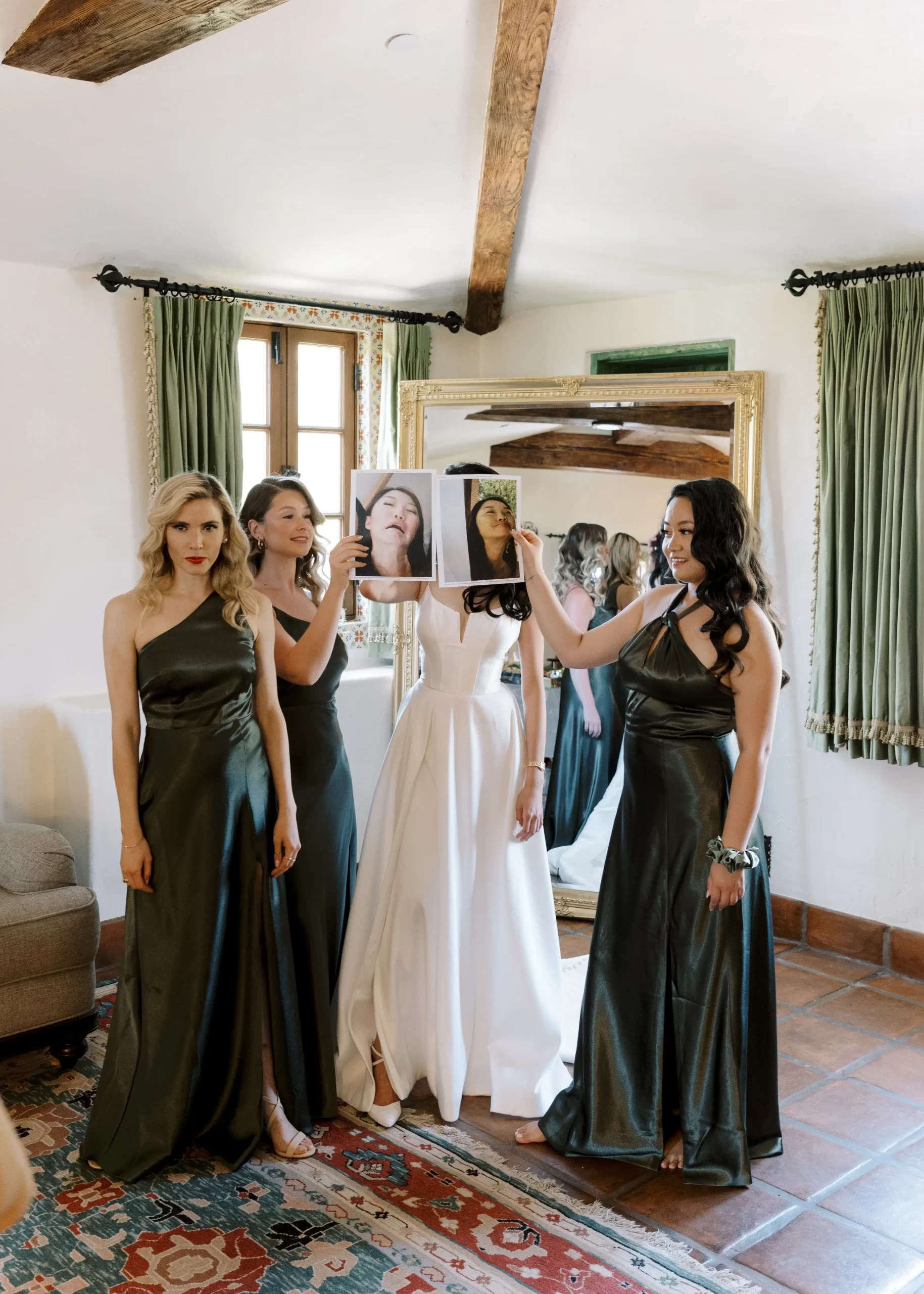 We wanted our wedding theme to seamlessly blend with the venue’s overall vibe. Our first impression was ‘Old Hollywood Glamour’. (It’s no wonder that Damien Chazelle movie Babylon, starring Brad Pitt and Margot Robbie was filmed here) This inspired our choice of satin-finished dresses with clean lines for both the bride and bridesmaids. To lighten things up, we incorporated whimsical Mediterranean elements into our floral arrangements and stationery.