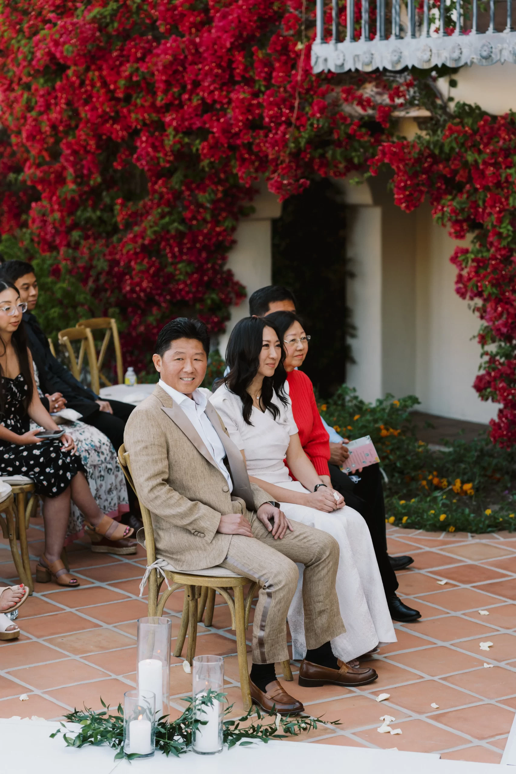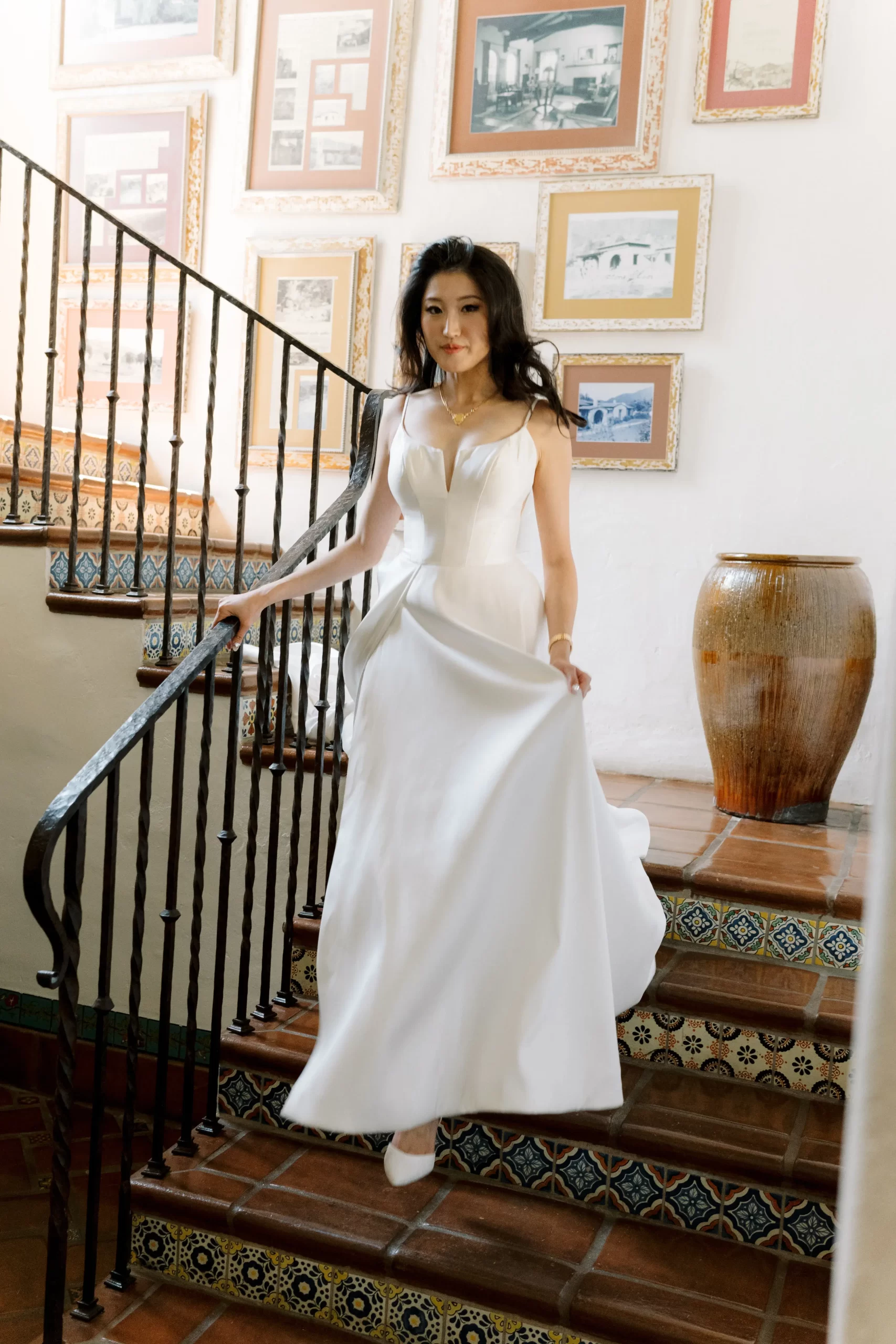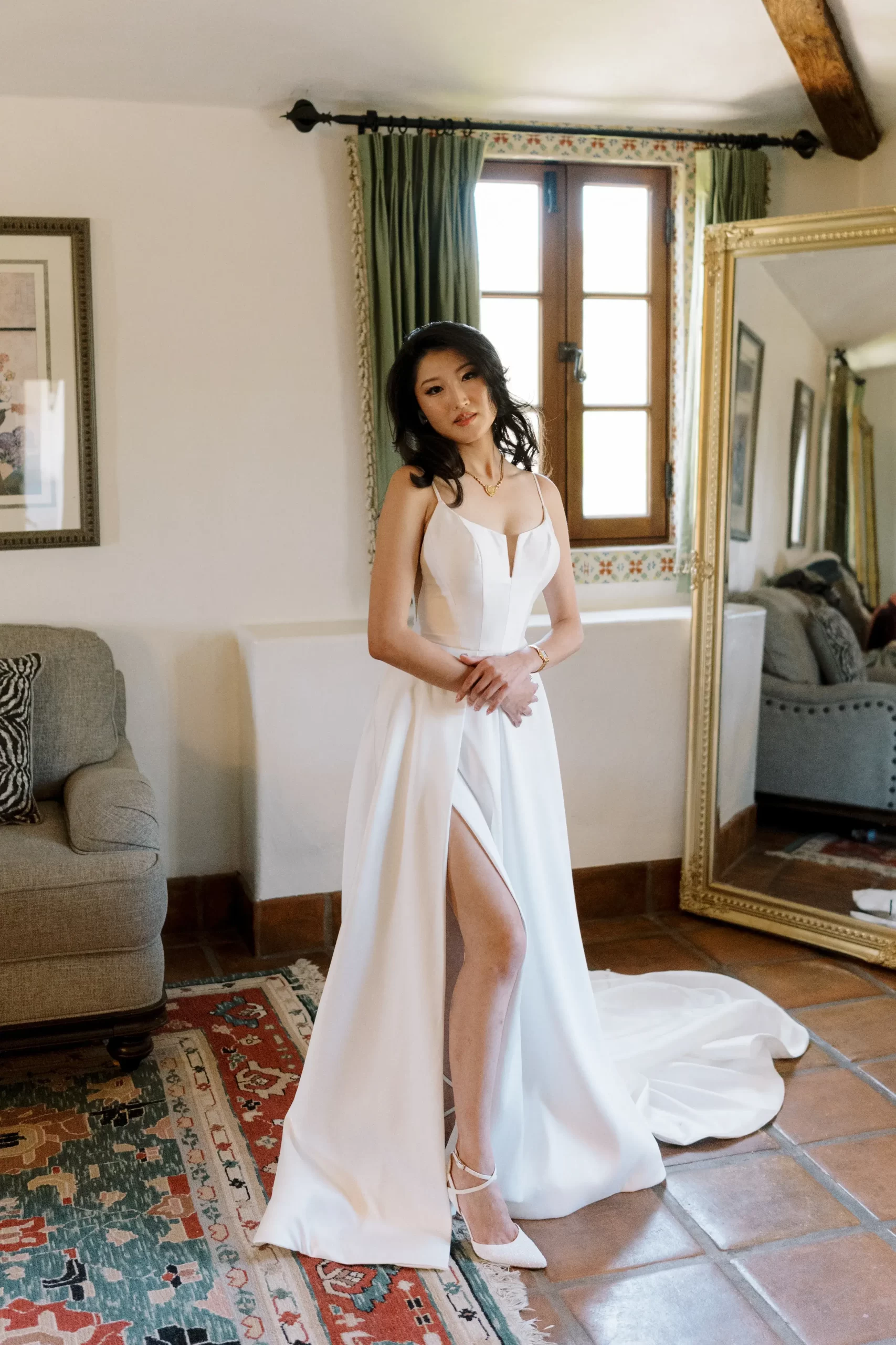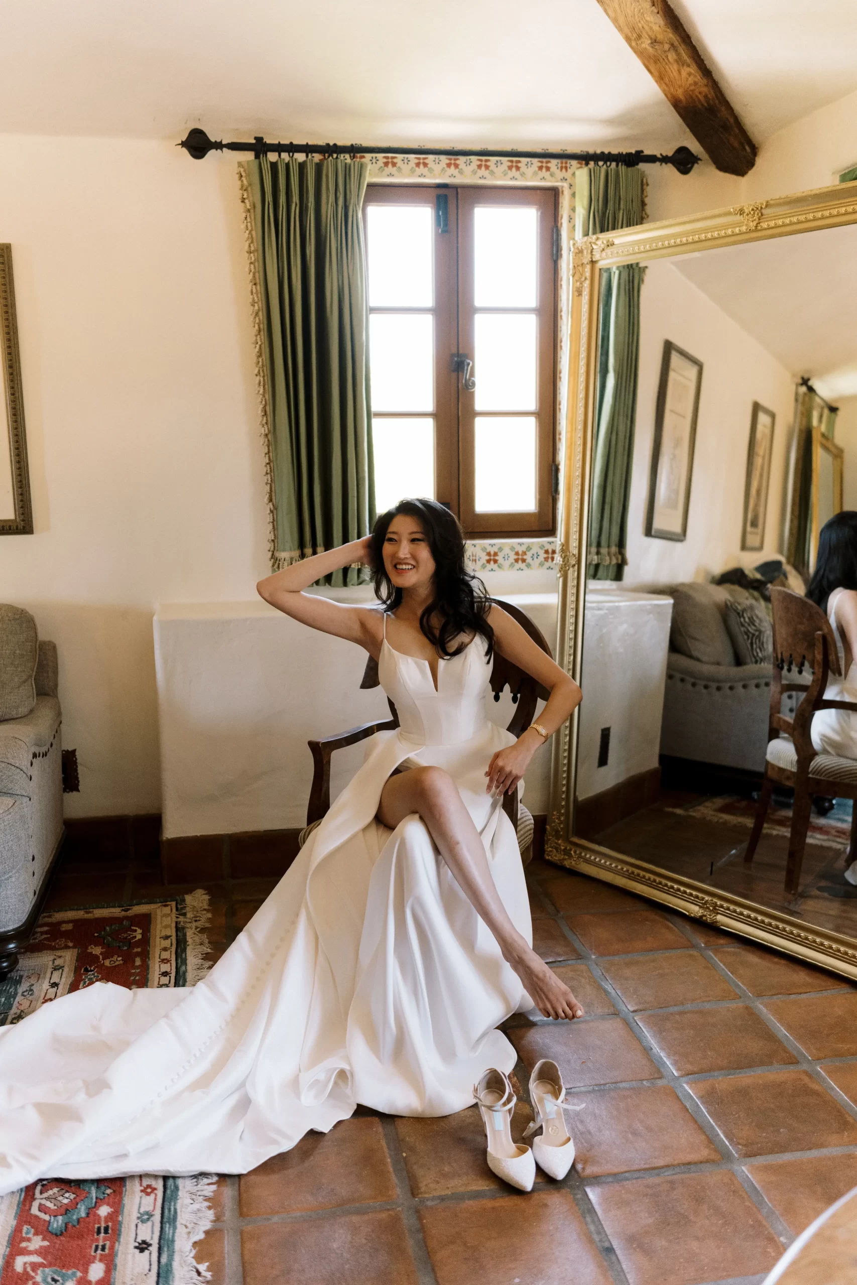 We wanted our wedding theme to seamlessly blend with the venue’s overall vibe. Our first impression was ‘Old Hollywood Glamour’. (It’s no wonder that Damien Chazelle movie Babylon, starring Brad Pitt and Margot Robbie was filmed here) This inspired our choice of satin-finished dresses with clean lines for both the bride and bridesmaids. To lighten things up, we incorporated whimsical Mediterranean elements into our floral arrangements and stationery.