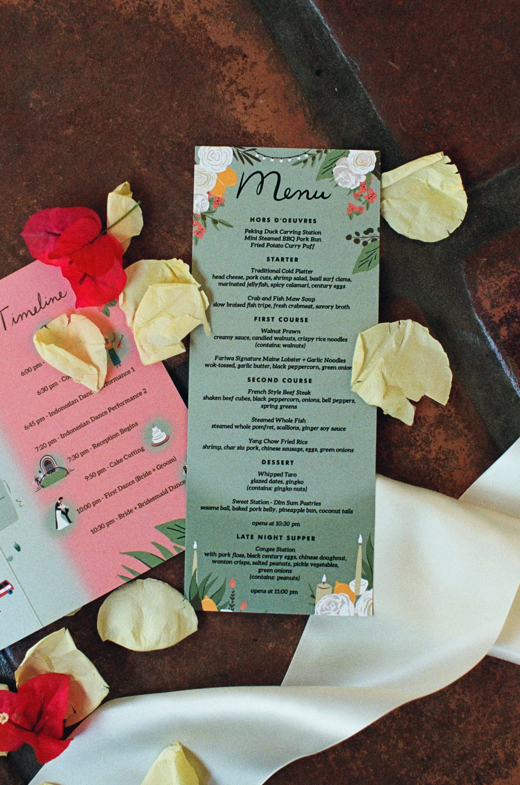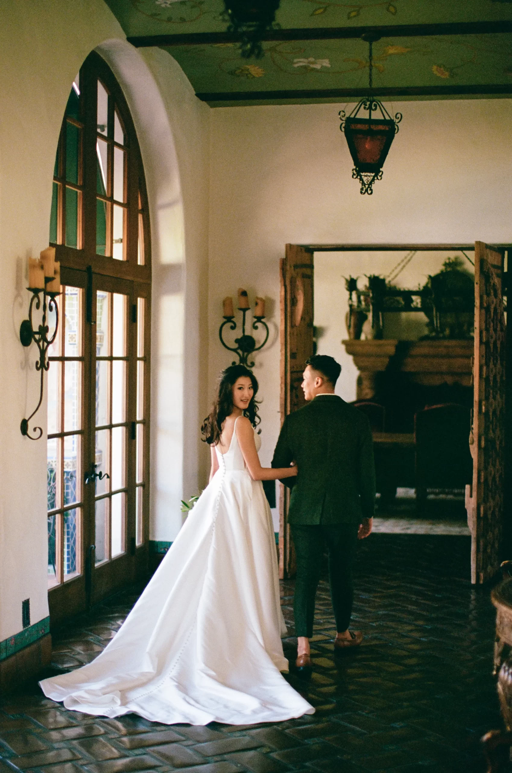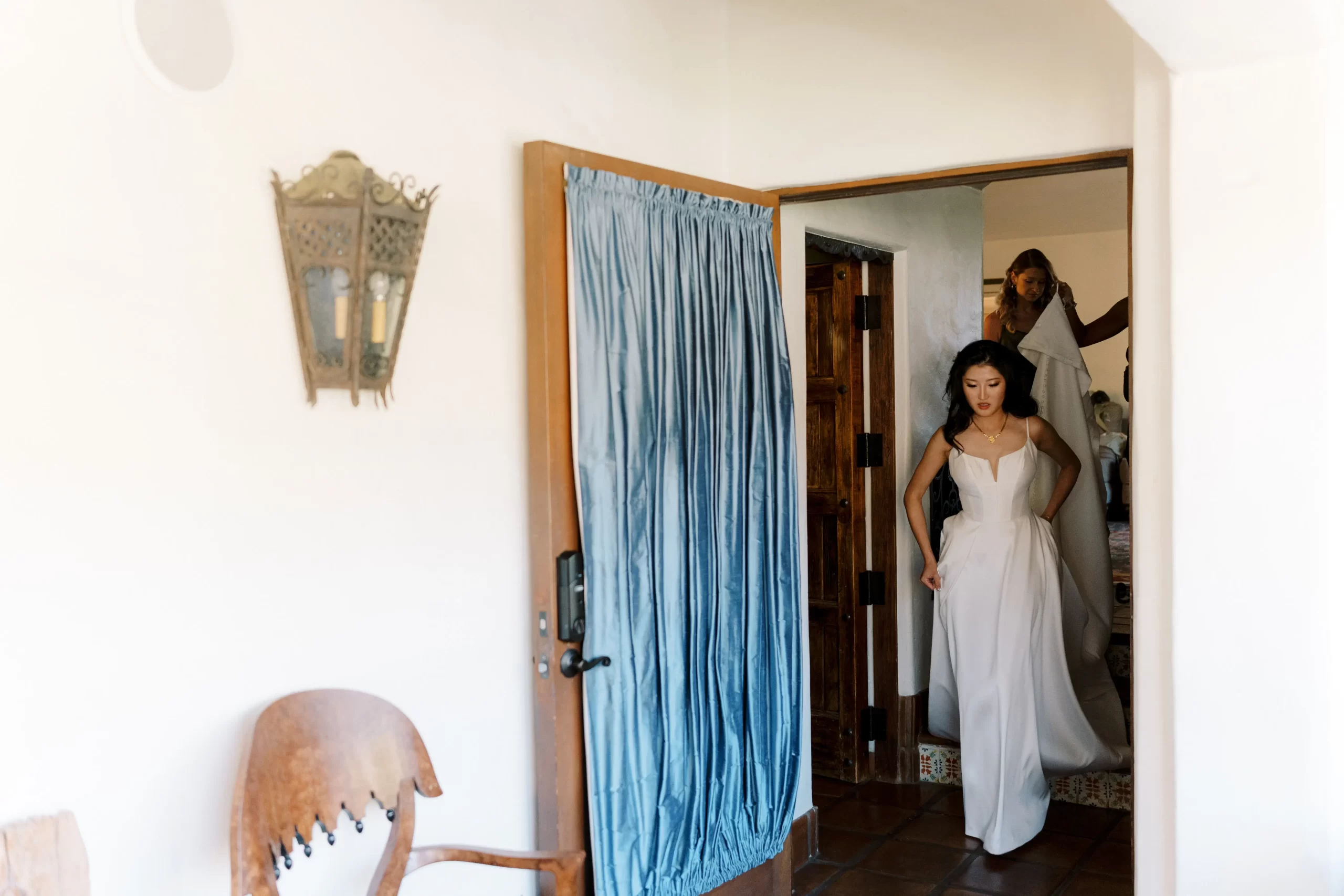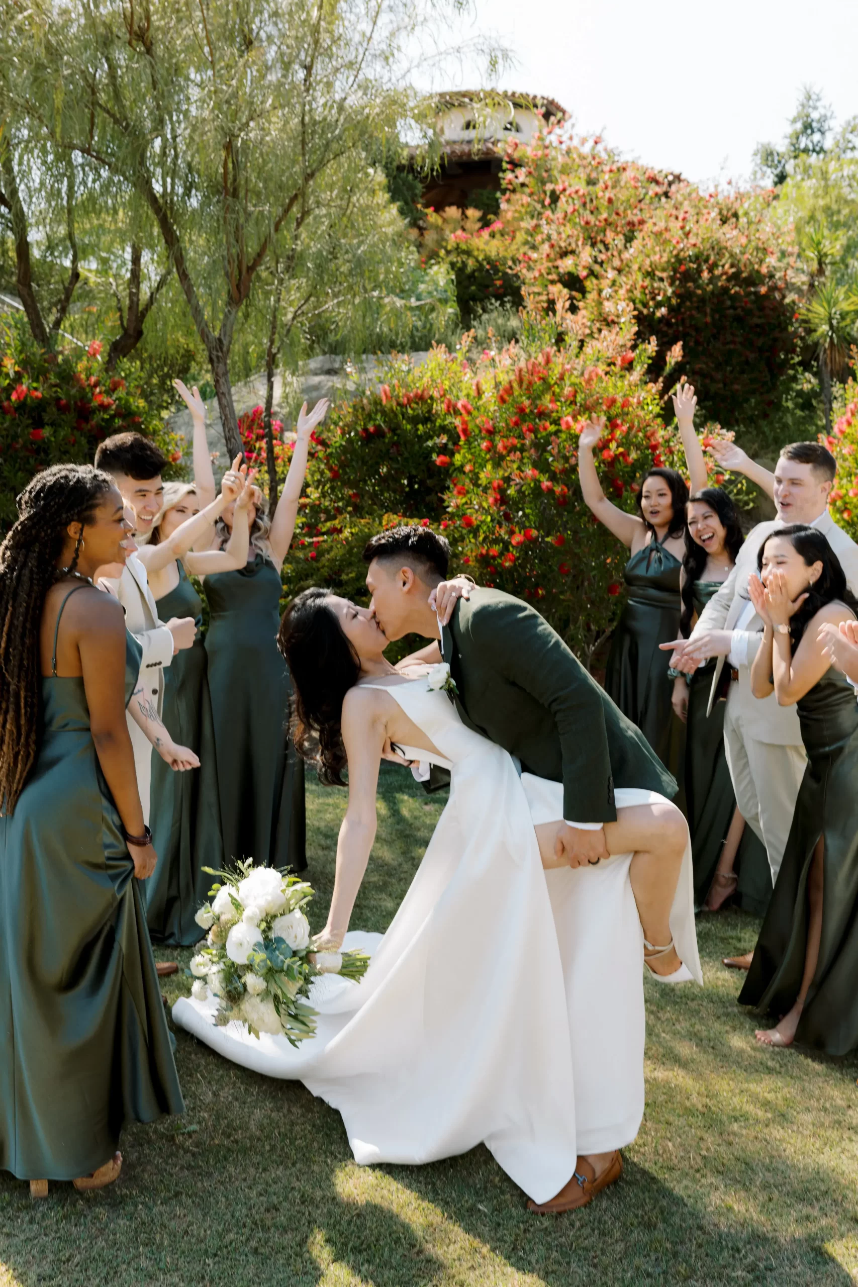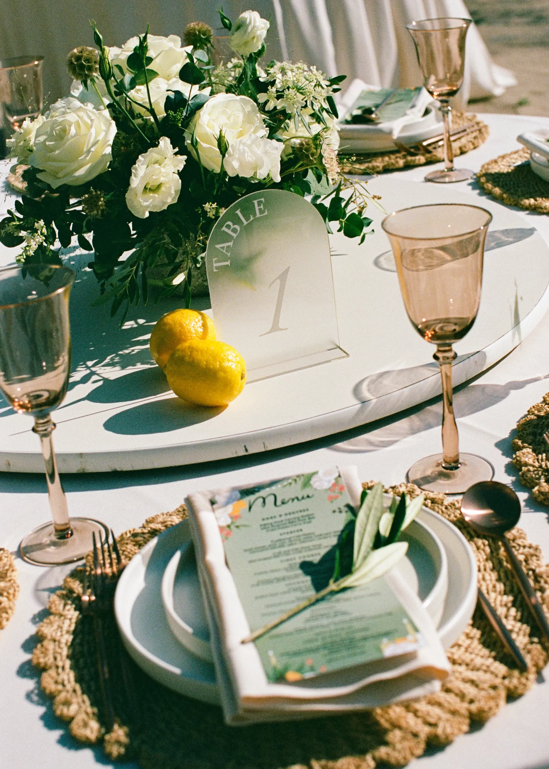We wanted our wedding theme to seamlessly blend with the venue’s overall vibe. Our first impression was ‘Old Hollywood Glamour’. (It’s no wonder that Damien Chazelle movie Babylon, starring Brad Pitt and Margot Robbie was filmed here) This inspired our choice of satin-finished dresses with clean lines for both the bride and bridesmaids. To lighten things up, we incorporated whimsical Mediterranean elements into our floral arrangements and stationery.