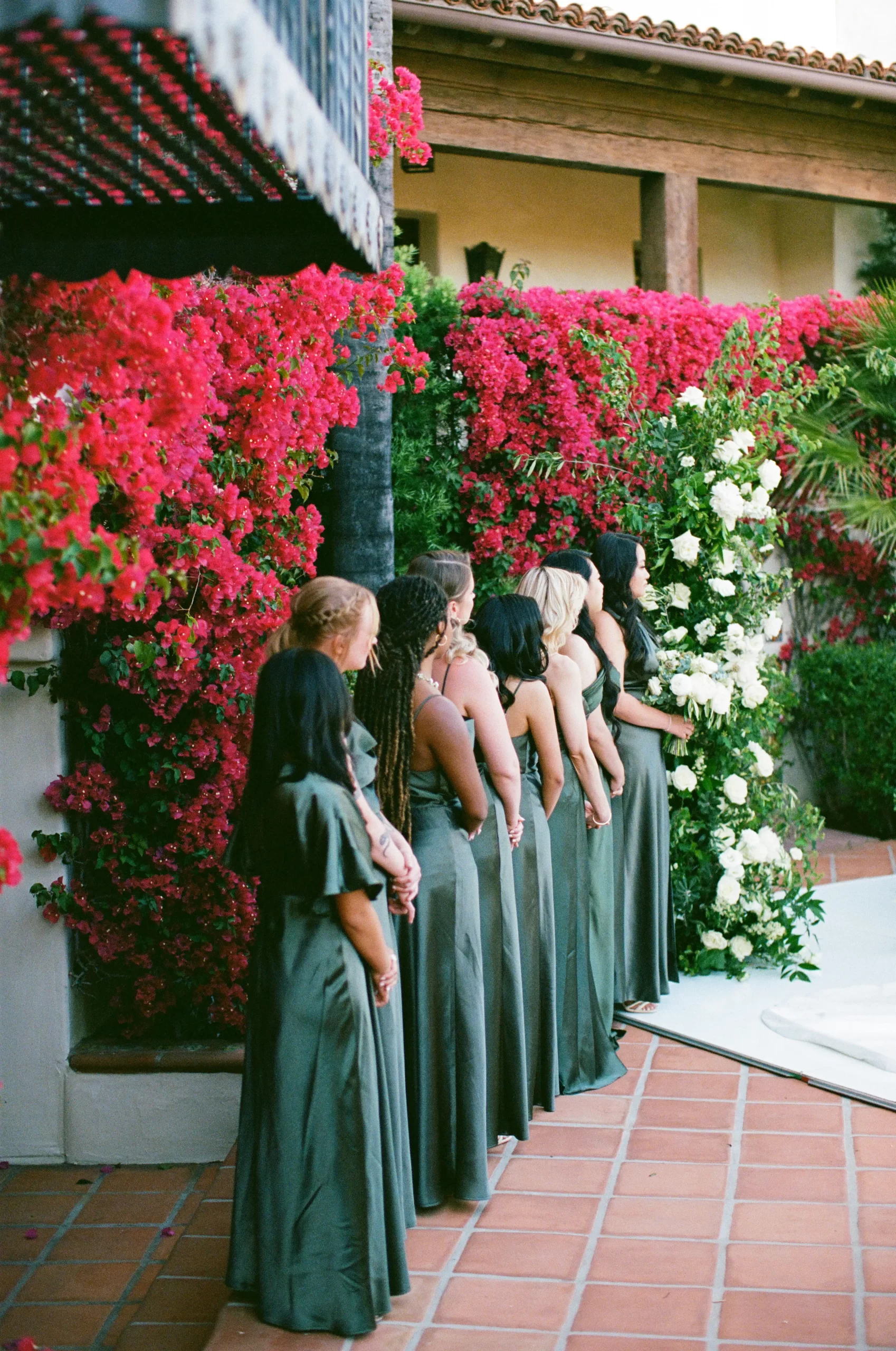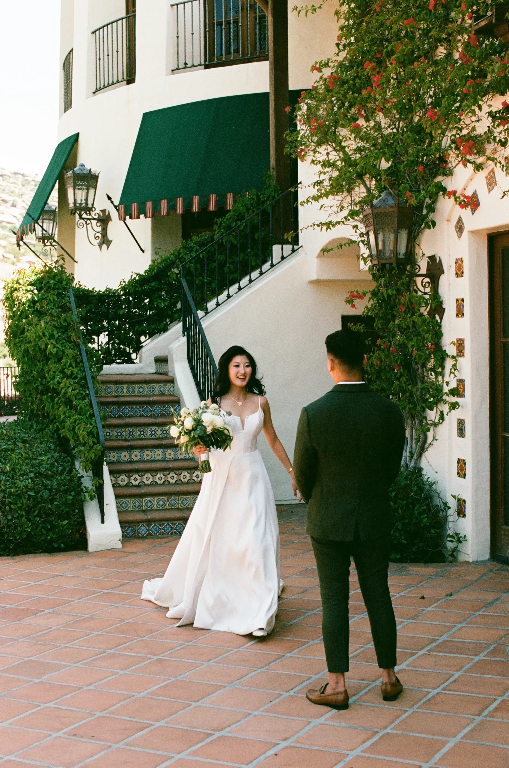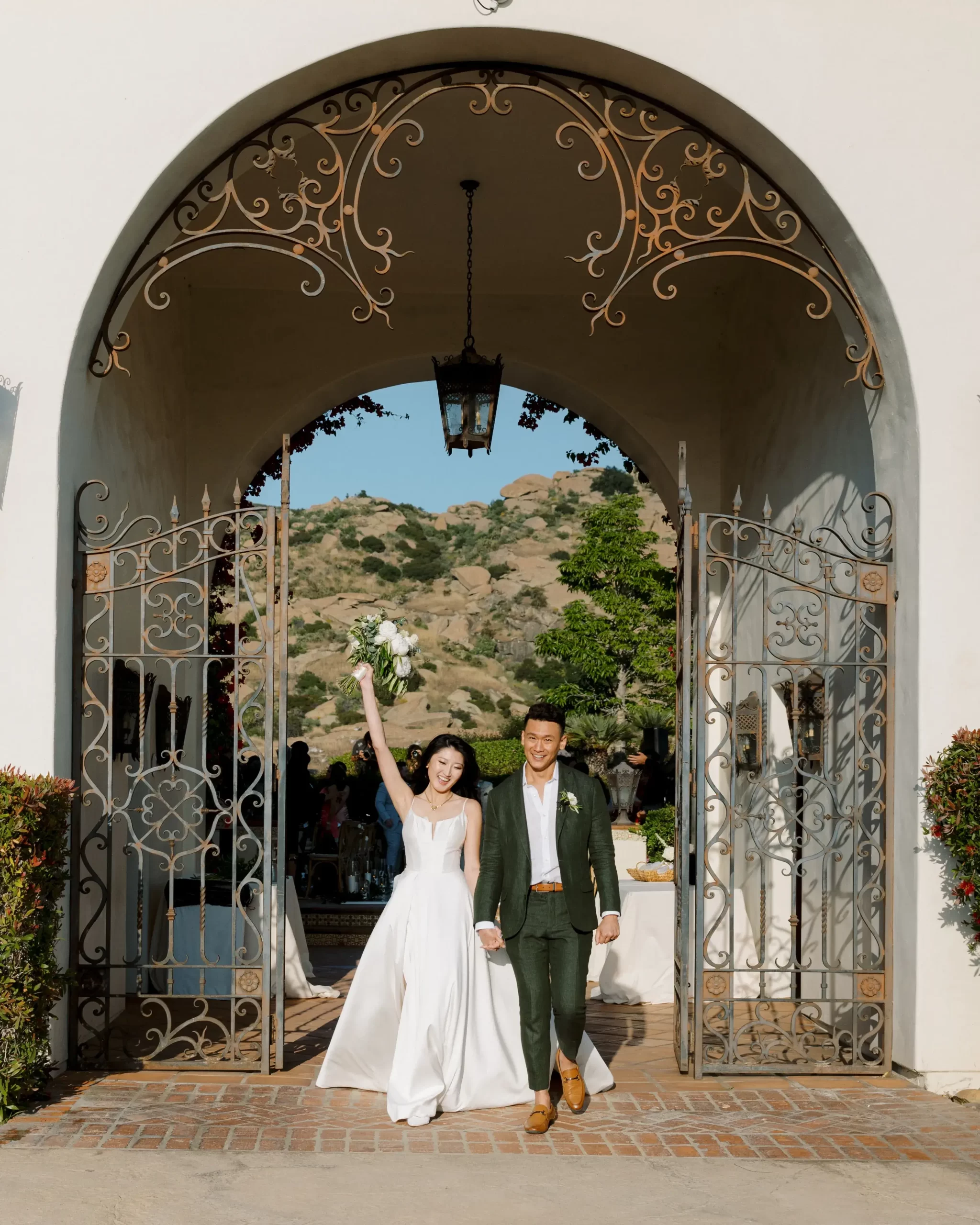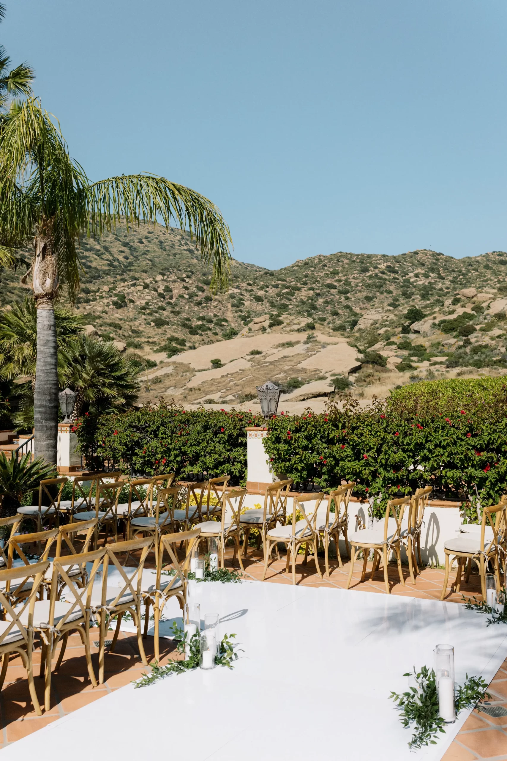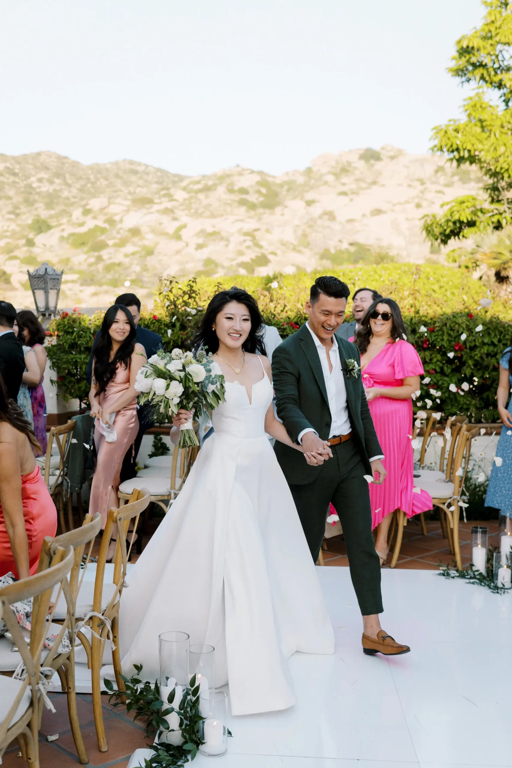 Like many couples, we fell into the Pinterest trap. We had a mishmash of color schemes and ideas. That was until we stumbled upon our perfect California mountain venue. Inspired by the natural beauty around us: clear blue skies, vibrant olive trees, warm terracotta tones, and deep fuchsia florals – we asked ourselves “Why would we want to take away from this?” So we kept our florals a neutral palette of olive greens and whites so that we would not clash with the already existing colors found on the venue.