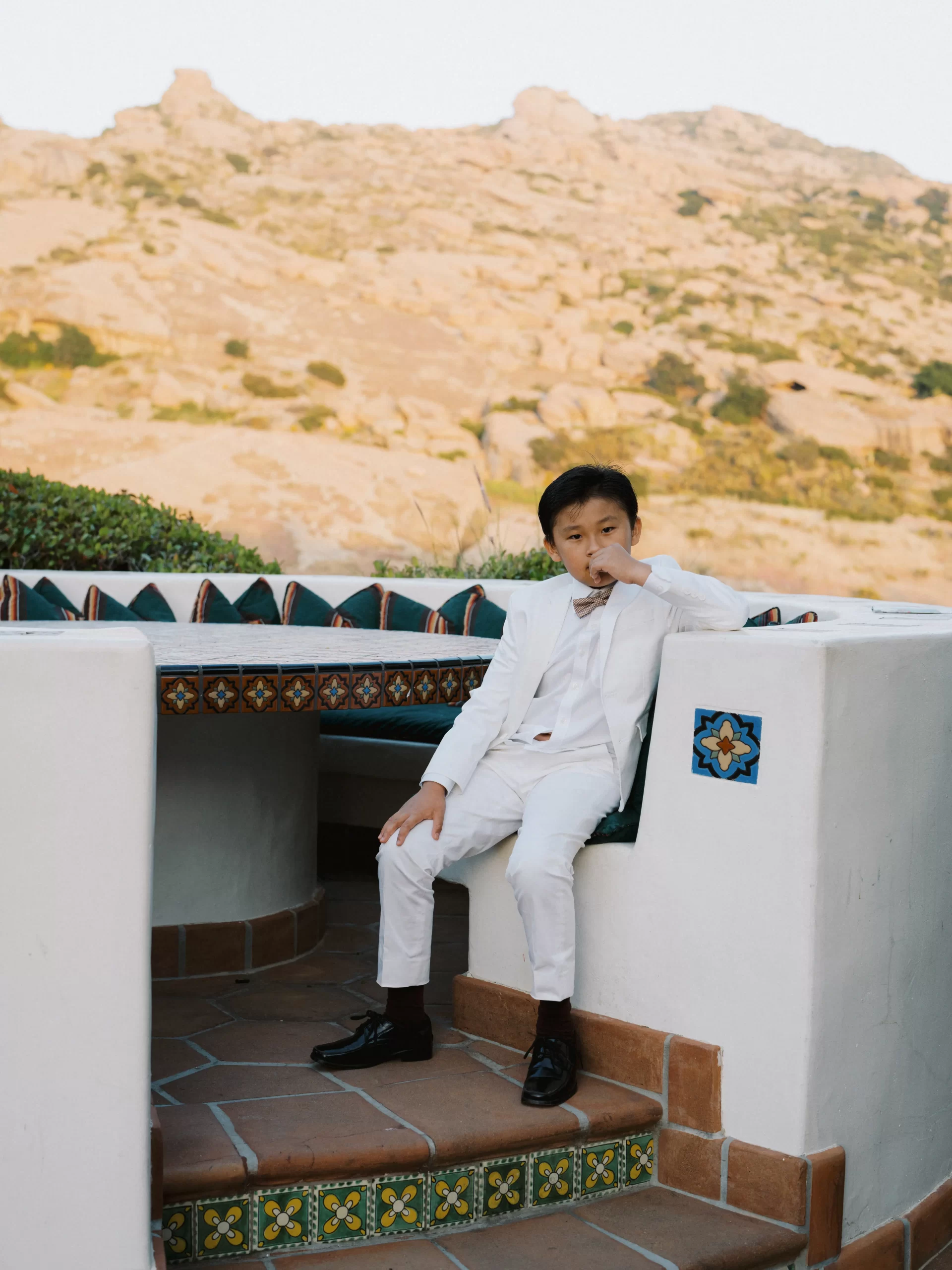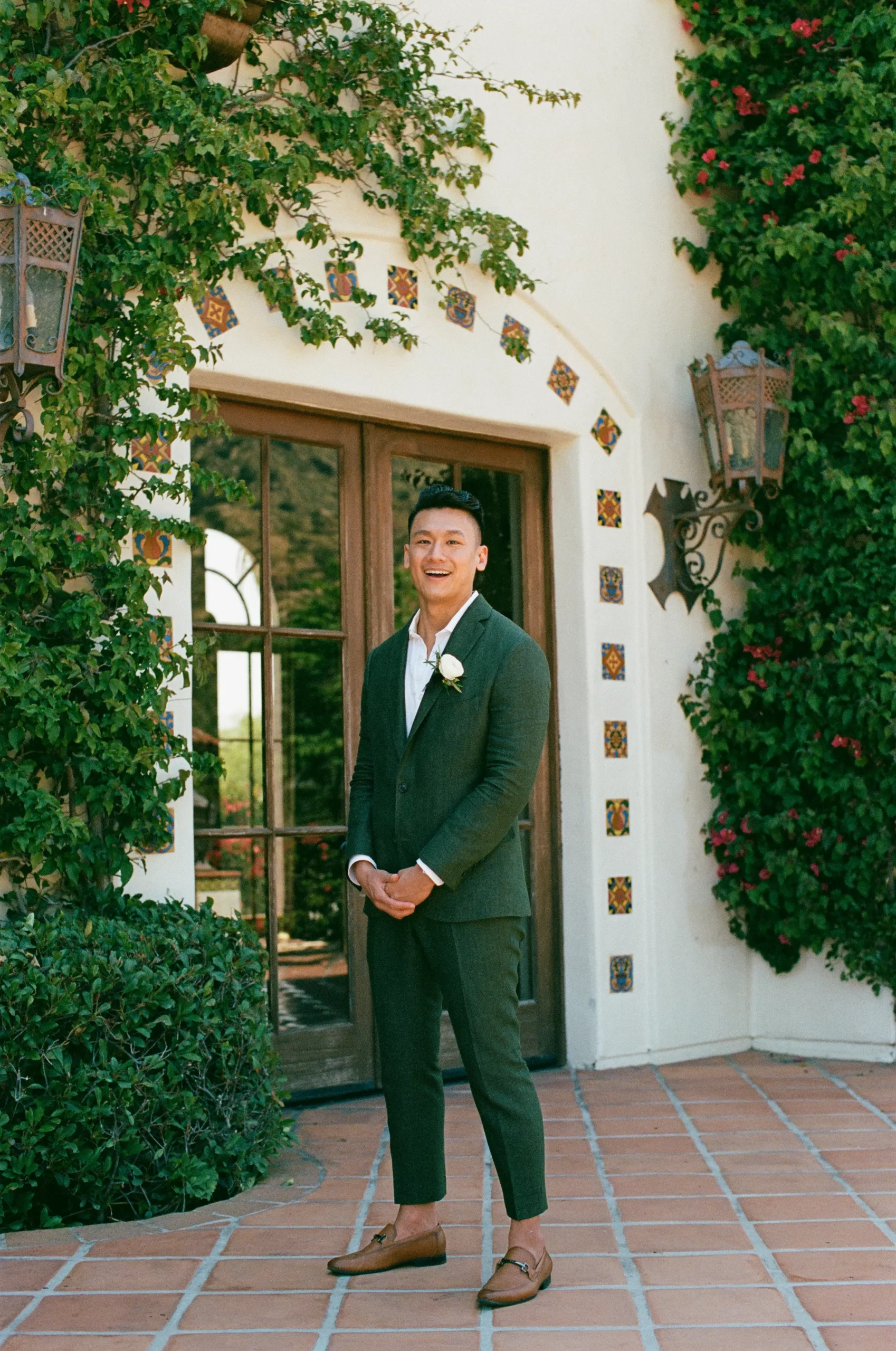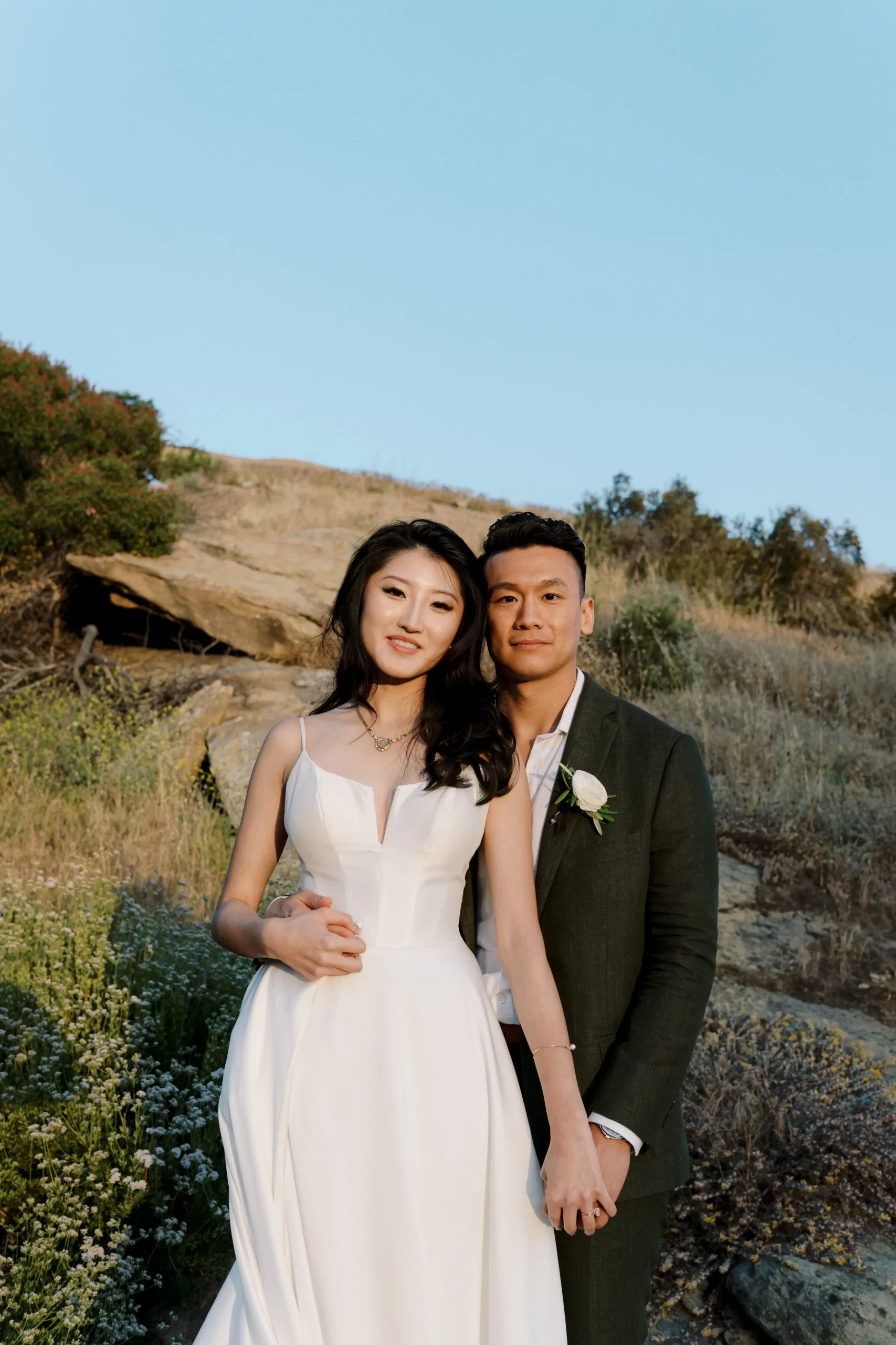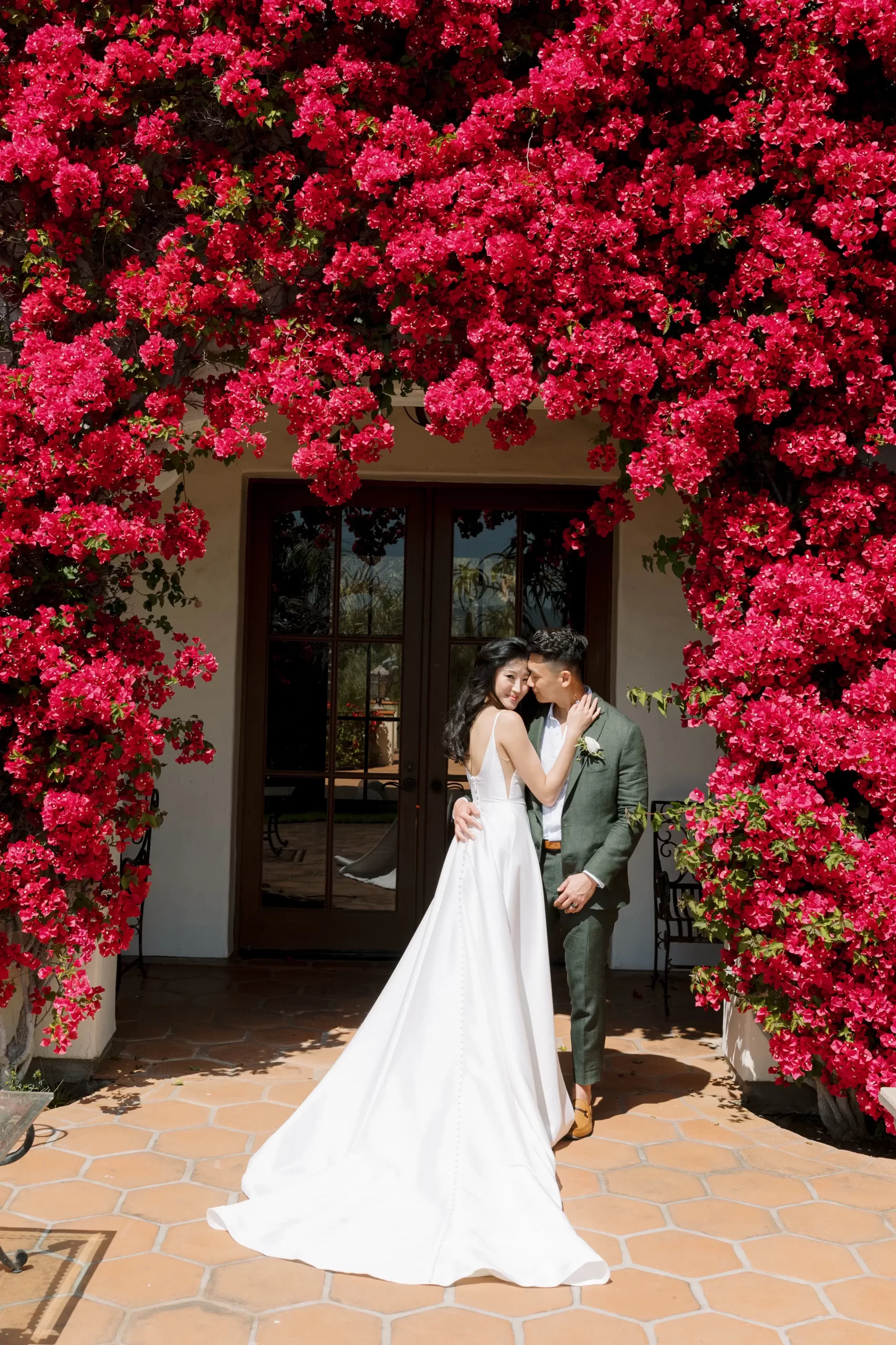 Like many couples, we fell into the Pinterest trap. We had a mishmash of color schemes and ideas. That was until we stumbled upon our perfect California mountain venue. Inspired by the natural beauty around us: clear blue skies, vibrant olive trees, warm terracotta tones, and deep fuchsia florals – we asked ourselves “Why would we want to take away from this?” So we kept our florals a neutral palette of olive greens and whites so that we would not clash with the already existing colors found on the venue.