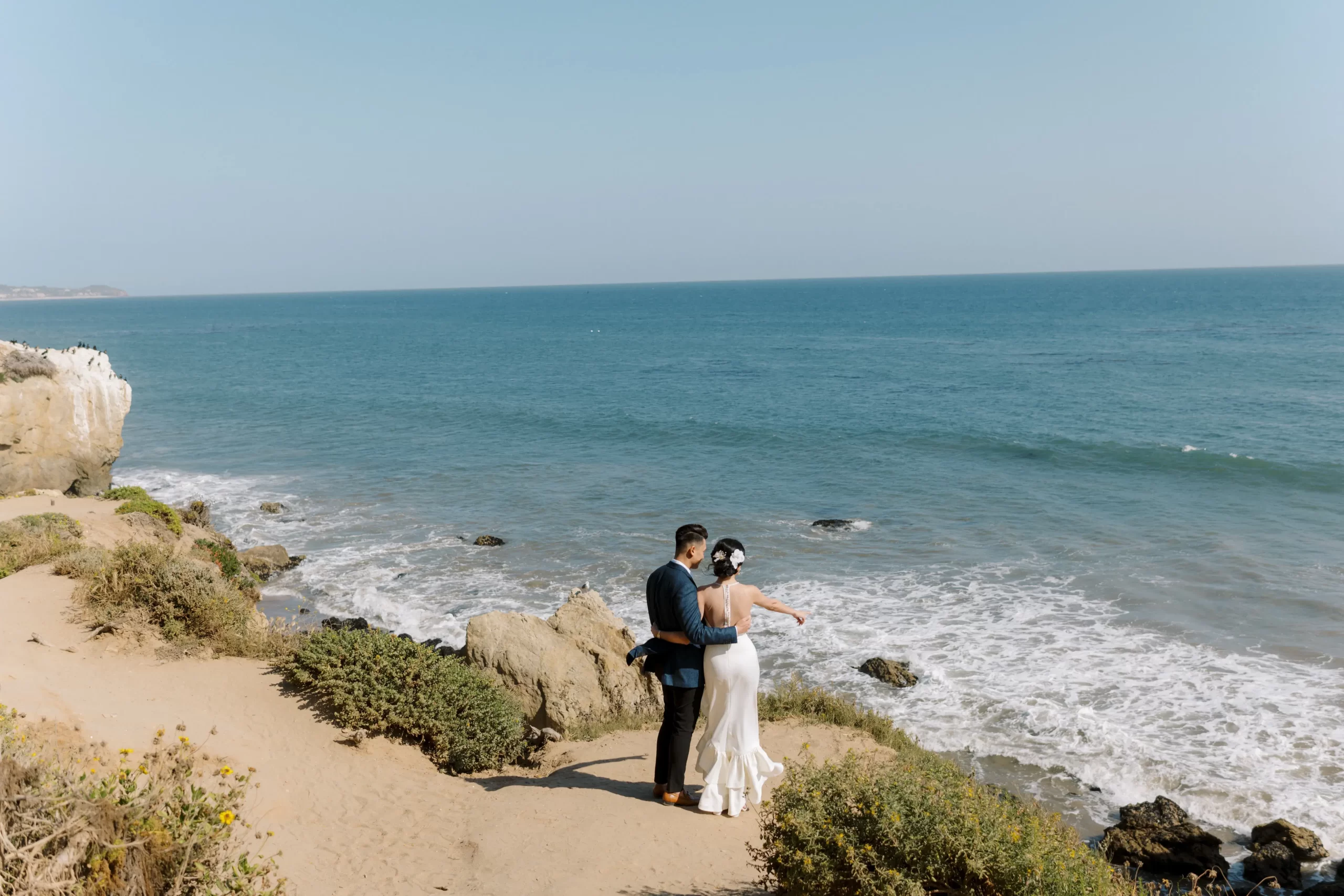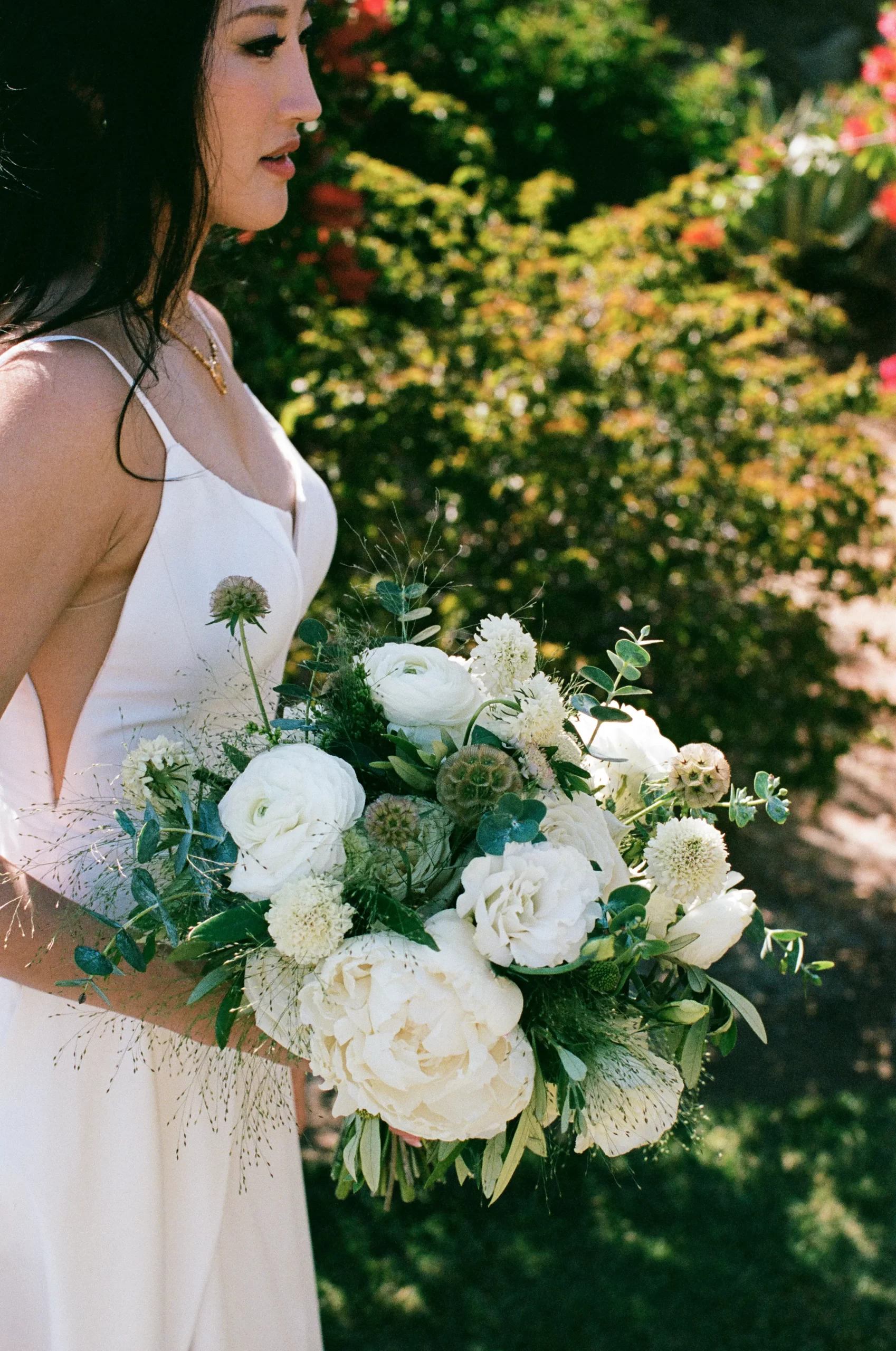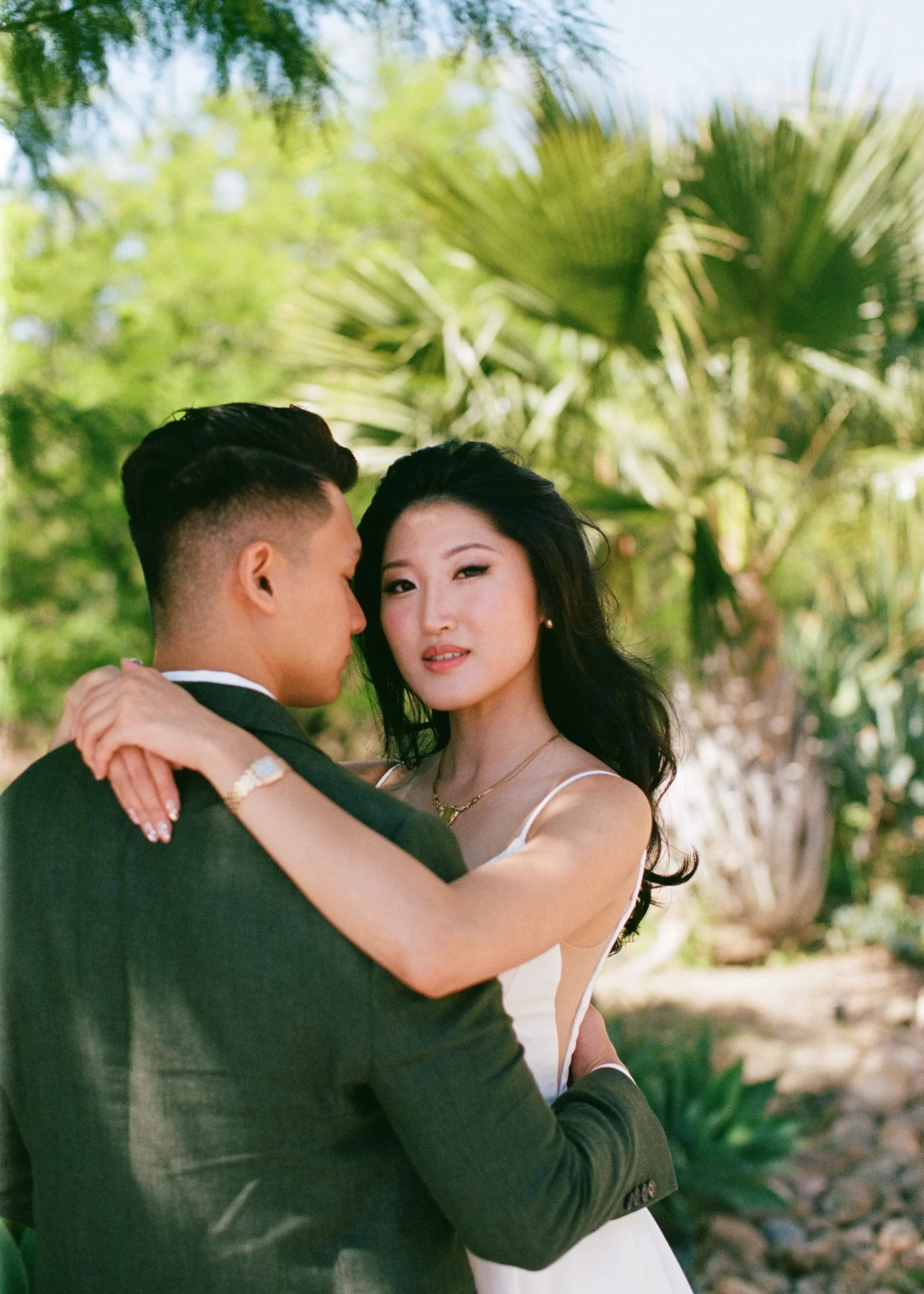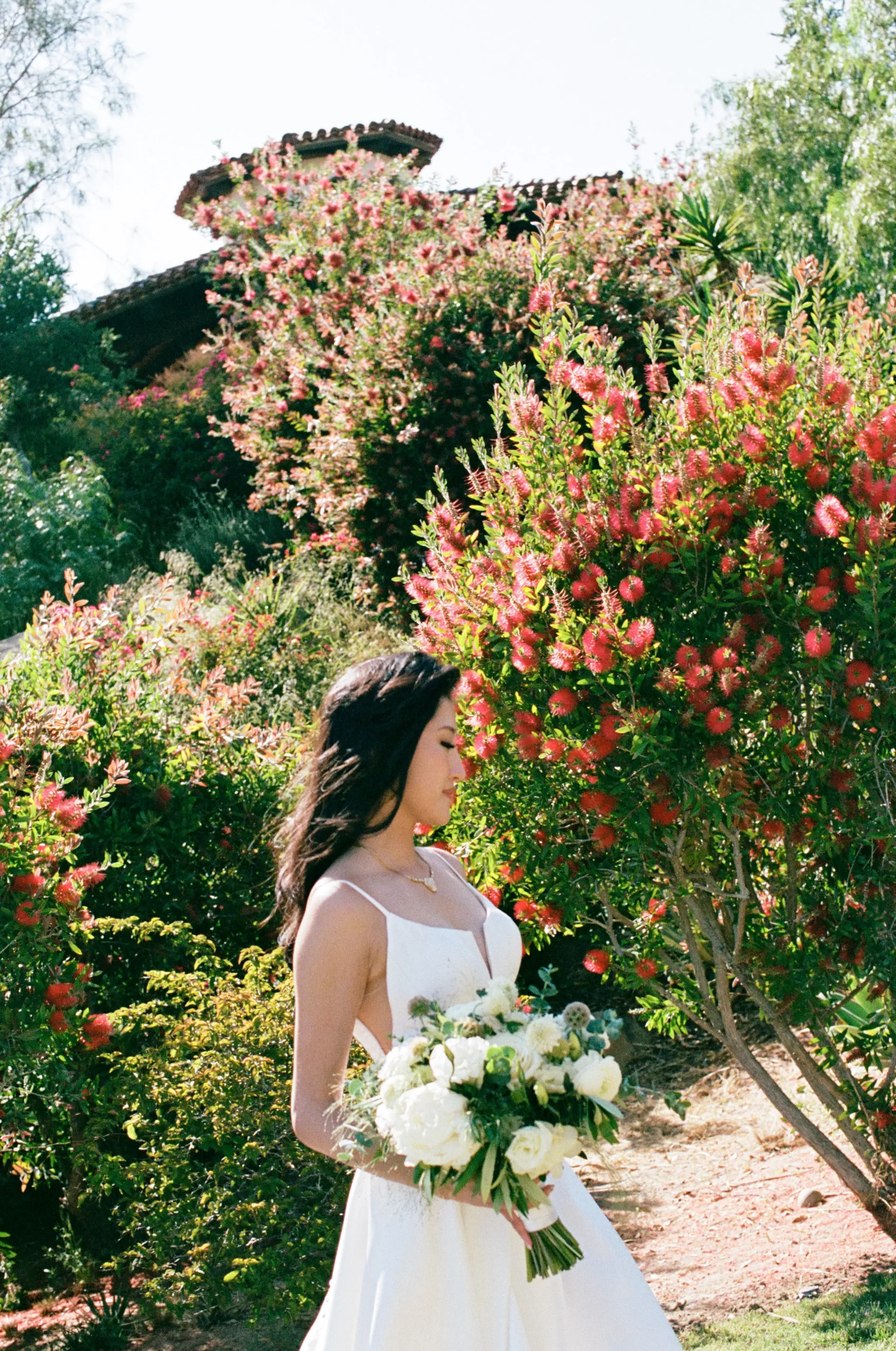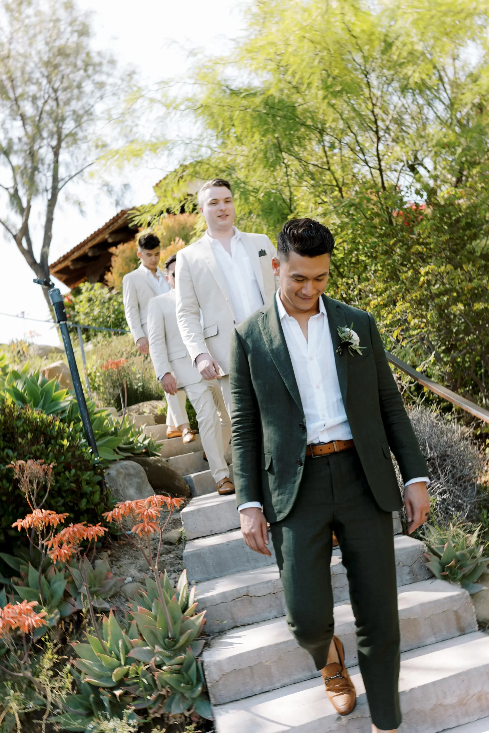 Like many couples, we fell into the Pinterest trap. We had a mishmash of color schemes and ideas. That was until we stumbled upon our perfect California mountain venue. Inspired by the natural beauty around us: clear blue skies, vibrant olive trees, warm terracotta tones, and deep fuchsia florals – we asked ourselves “Why would we want to take away from this?” So we kept our florals a neutral palette of olive greens and whites so that we would not clash with the already existing colors found on the venue.